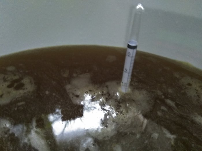 Вылил всё сваренное сусло в бродильную ёмкость и сверху долил бутылированной воды до 23 литров. Всем, кто будет варить медовуху по похожему рецепту люто советую бутылки с водой предварительно закинуть в холодильник, ибо мне пришлось ждать до утра пока температура сусла опустится ниже 28 градусов, для того, чтобы запустить туда дрожжи. Начальная плотность сусла 13 единиц.