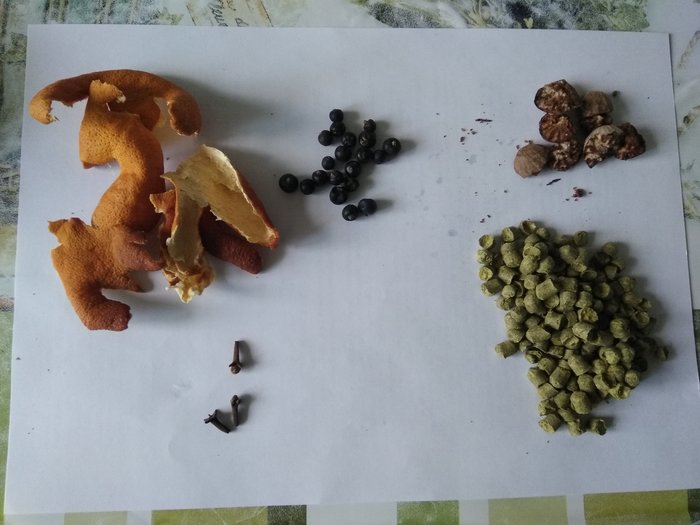 При варке второй части мёда, я подготовил все специи и хмель. Их набрал по вкусу. Ну такой вот примерно рецепт усредненный, потому что вариаций масса: