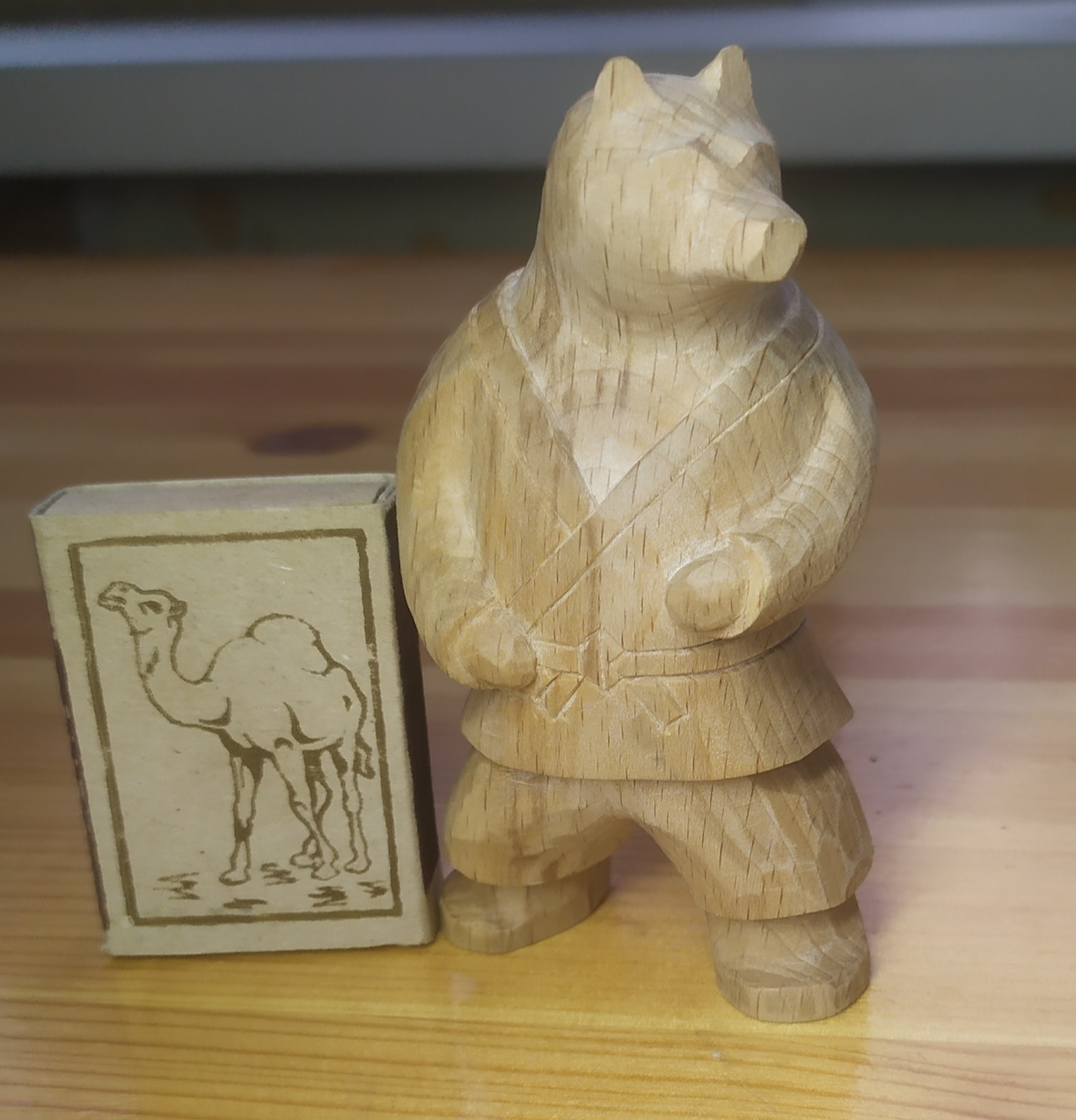 Появились идея сделать подарок другу, который занимается восточными единоборствами и проживает в заповеднике. Поэтому был вырезан медведь в кимоно.