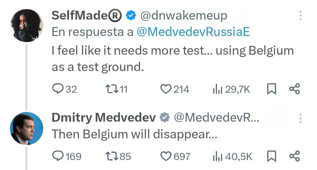 "Чувствую, ему ["Посейдону"] не помешало бы еще одно испытание... Испытательным полигоном могла бы стать Бельгия", написал в соцсети Медведеву пользователь @dnwakeup. На что Дмитрий Медведев ответил: "Тогда Бельгия исчезнет".