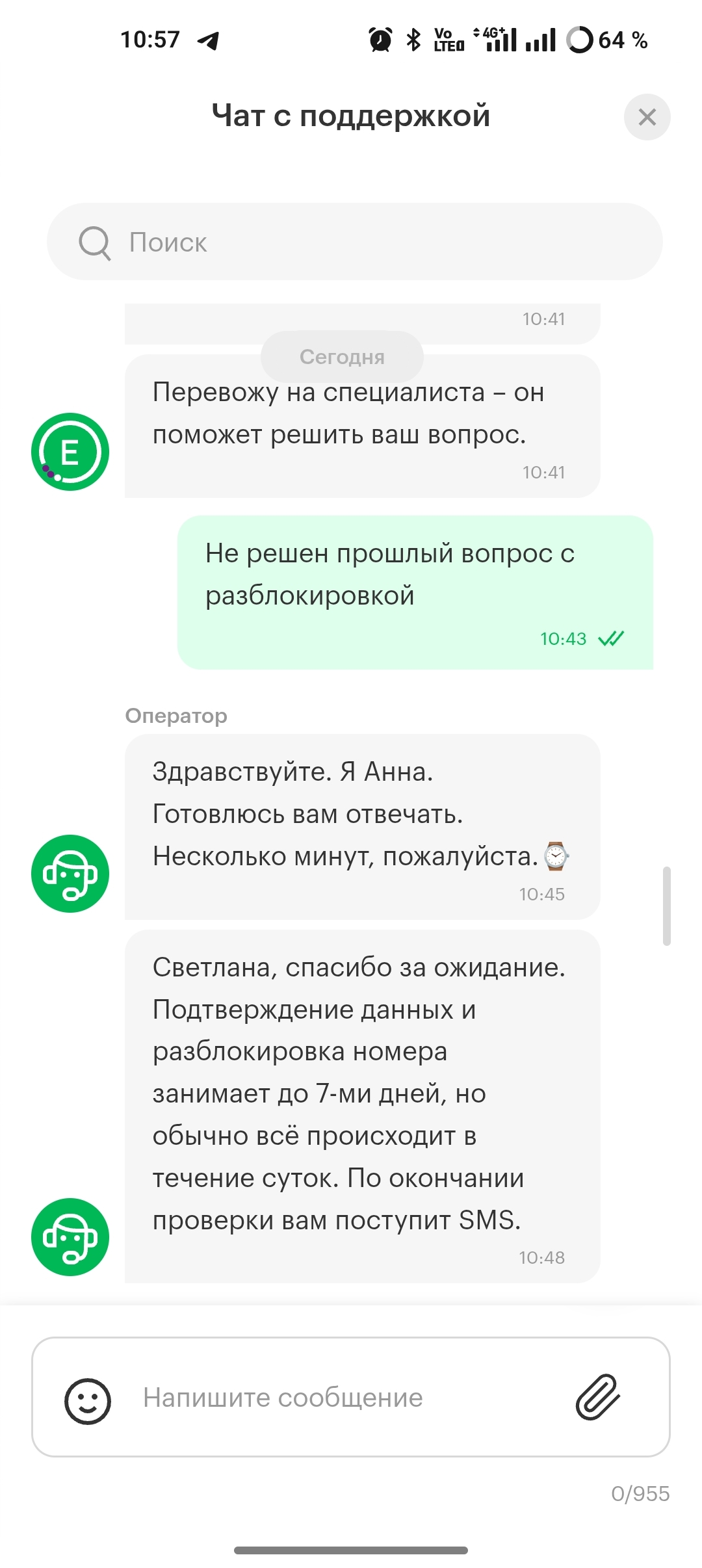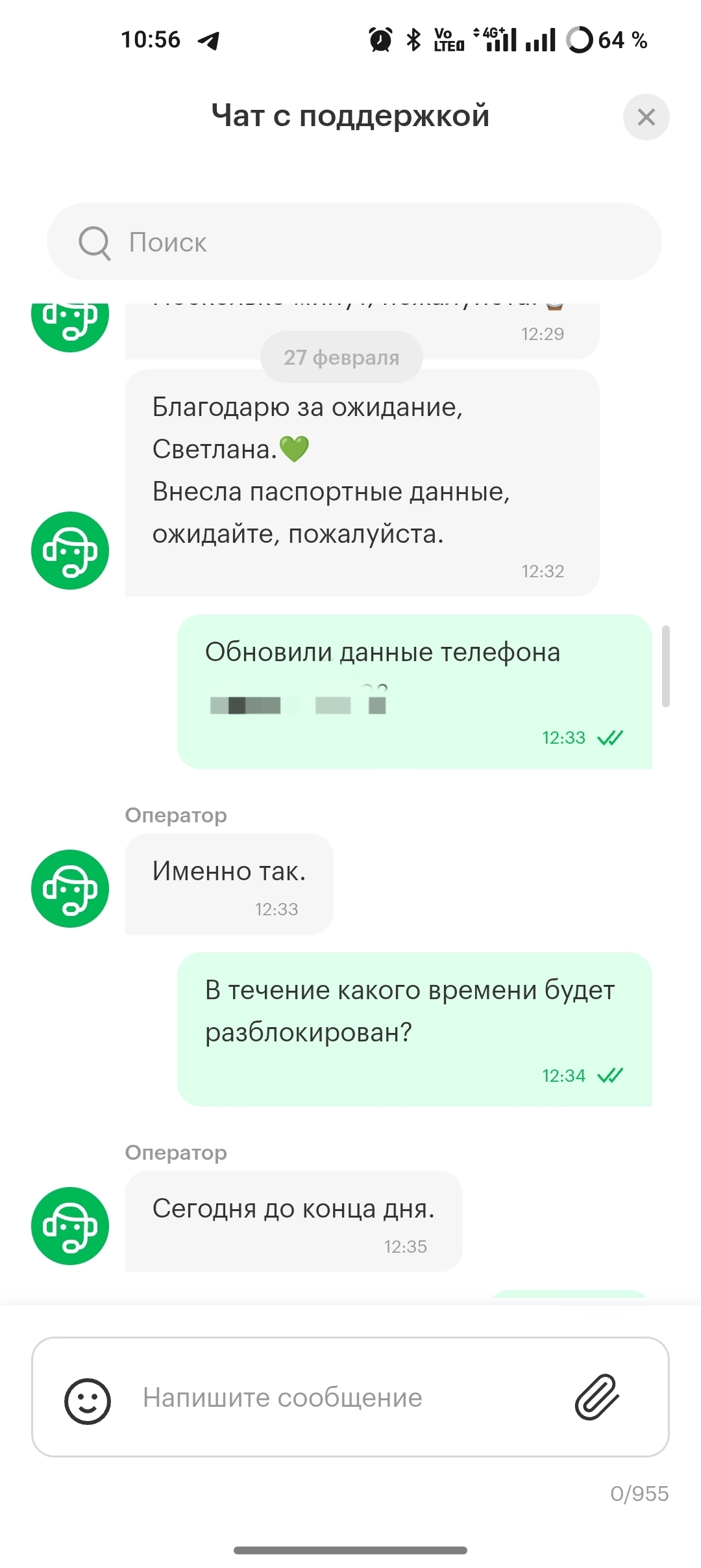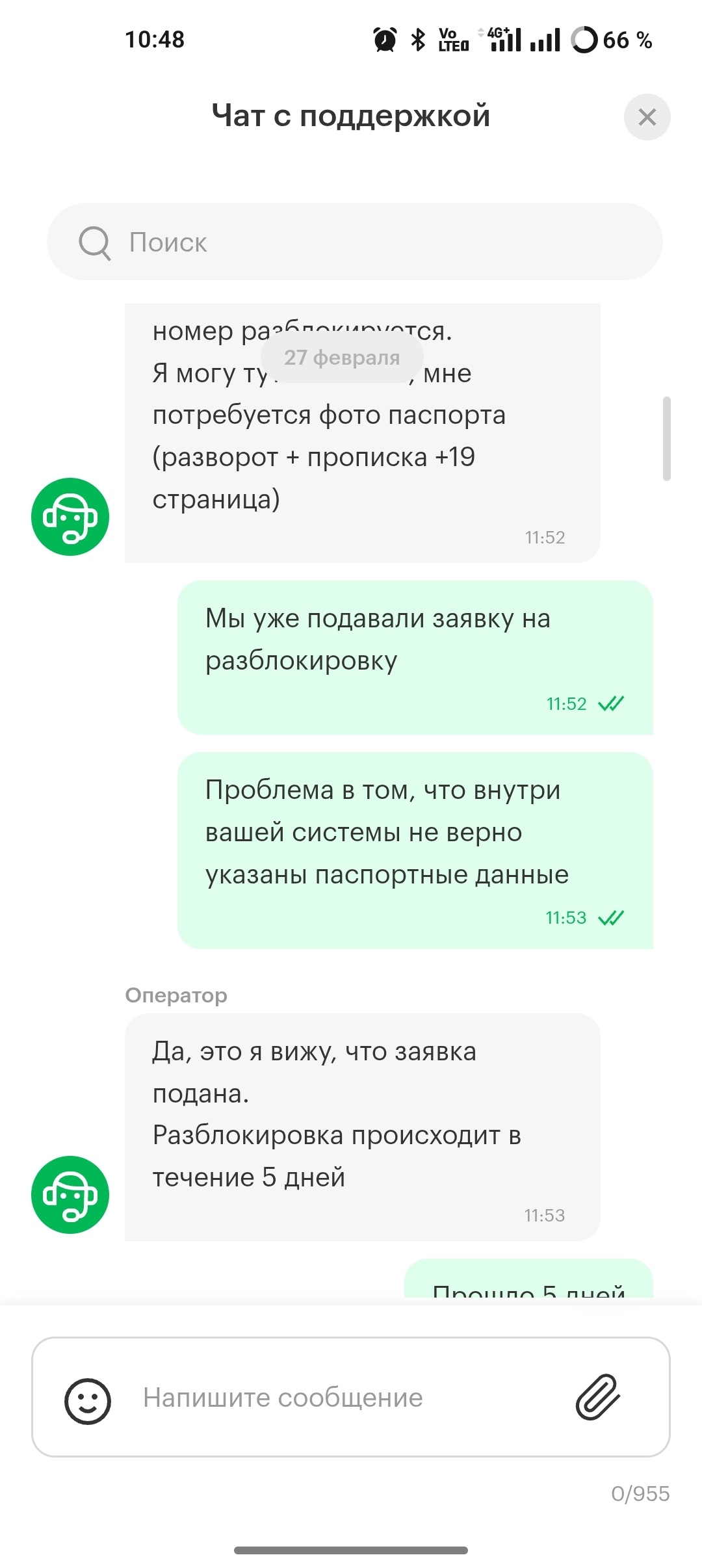 27ое число. Захожу в чат с поддержкой уже с другой симки. Здесь мне заявляют о 5 (!!!) днях проверки и разблокировки