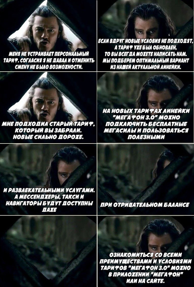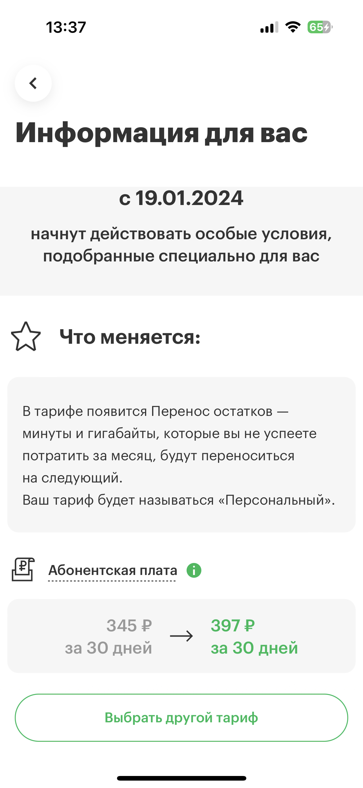 Недавно видел здесь пост про то, как мегафон отправил смс некому чемпиону выигрышного тарифа с пожизненными бесплатным обслуживанием уведомление о смене тарифа на персональный(платный для него) и как его дропнуть до определенного срока. НО, короче теперь походу смски пошли повально всем у кого недорогие на смену тарифа выпускают персональный(более дорогой), конечно оферта хитрая, но так делать это пездец, куча людей, которые могут по разным причинам не понять, что нужно сделать или просто за неделю не обращаться к телефону, а тариф автоматически сменится на условия удобные только мегафону. Я то конечно отключу, но кто не отключит в кратчайшие сроки, мегафон получит нехилую прибыль.