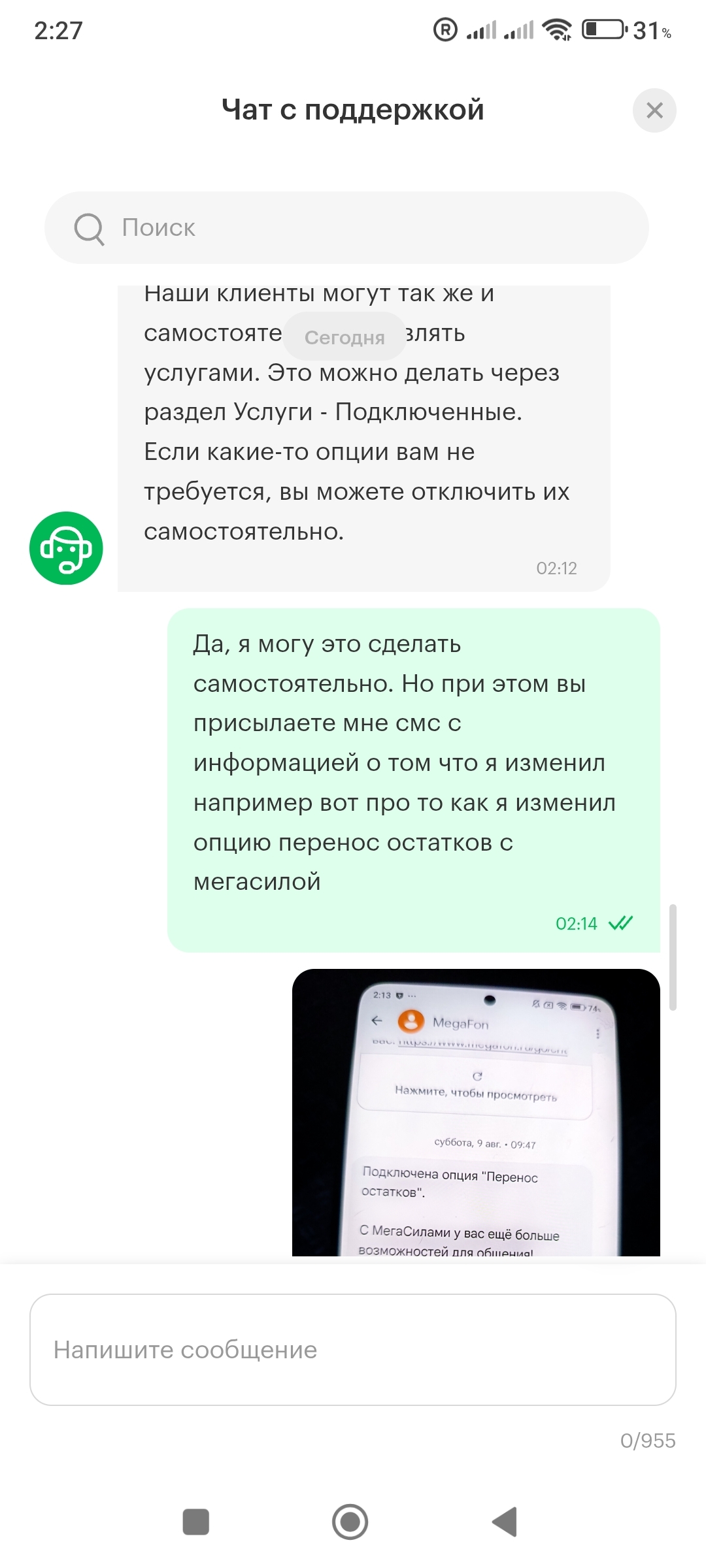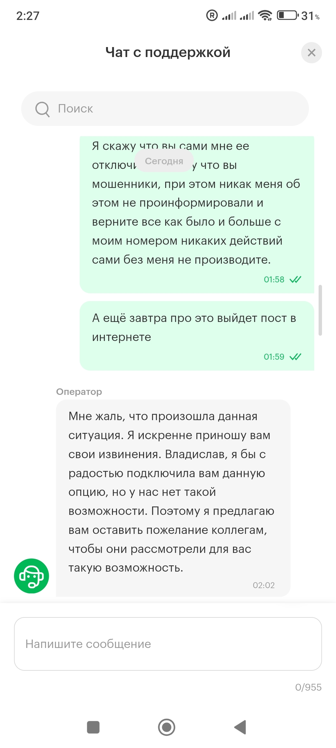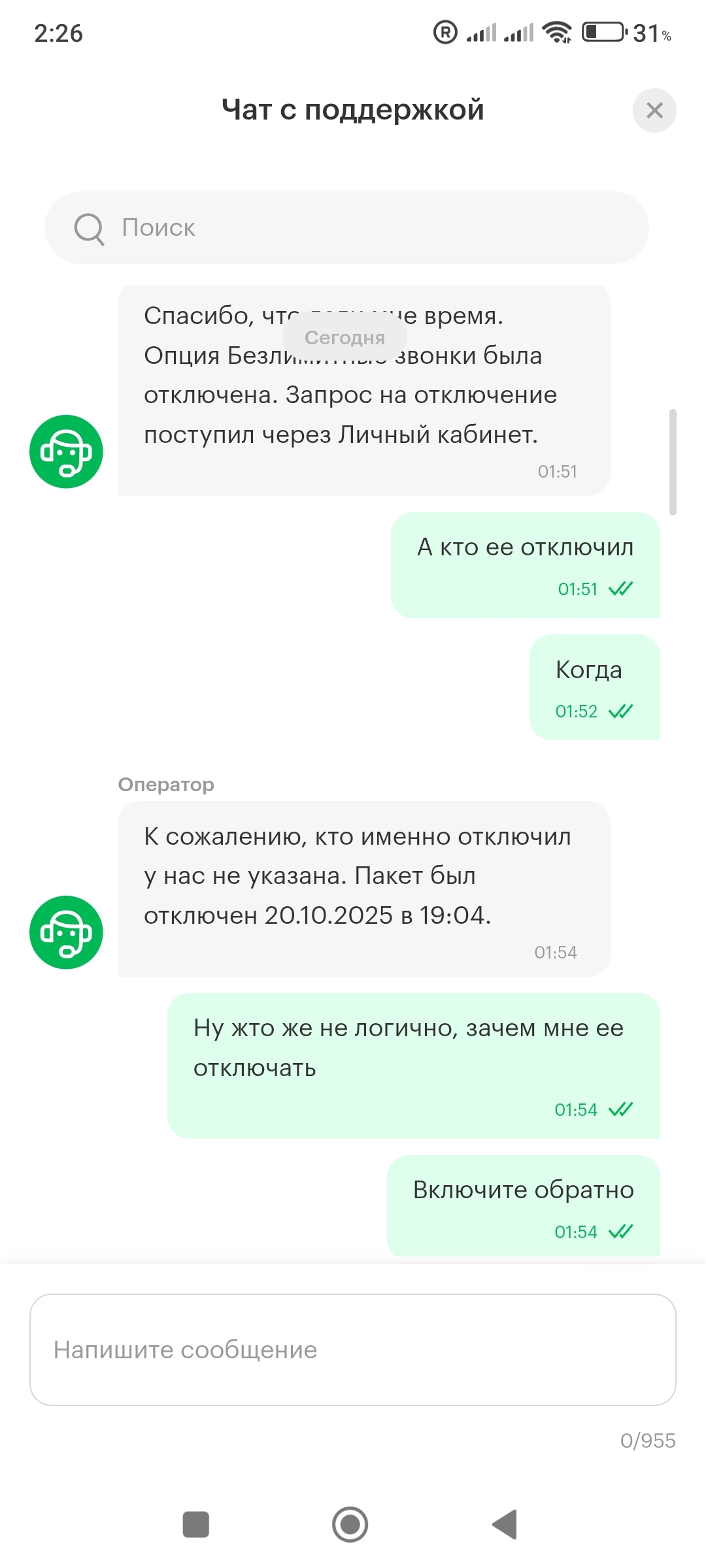 У меня уже несколько лет к тарифу подключена бесплатная опция безлимитные звонки. Ну еще безлимитный интернет, но это к делу не относится. При этом минут я наговаривал всегда мало, но все равно было приятно что не надо считать. Вчера захожу я в личный кабинет и вижу что про звонки больше не написано что они безлимитные, а написано несколько тысяч минут. Я написал оператору как это так отключили мне опцию и даже никак не проинформировали. А она ответила что это я сам себе бесплатные безлимитные звонки отключил 20 октября в 19:04. Я сказал что зачем мне это делать, где логика. А она отвечает что значит моим личным кабинетом видимо завладели хакеры- мошенники, которые специализируются на том, чтобы менять людям опции в тарифе. Тогда я спросил, отправляли ли они мне 20 октября смс уведомления, ведь при смене опций они всегда отправляют. В качестве примера отправил ей скрин за август, где я добавил опцию перенос остатков и мне сразу пришла смс об том. Тут она уже не нашлась что ответить кроме того что опцию мне обратно включить уже почему то не могут, а только отключать умеют.