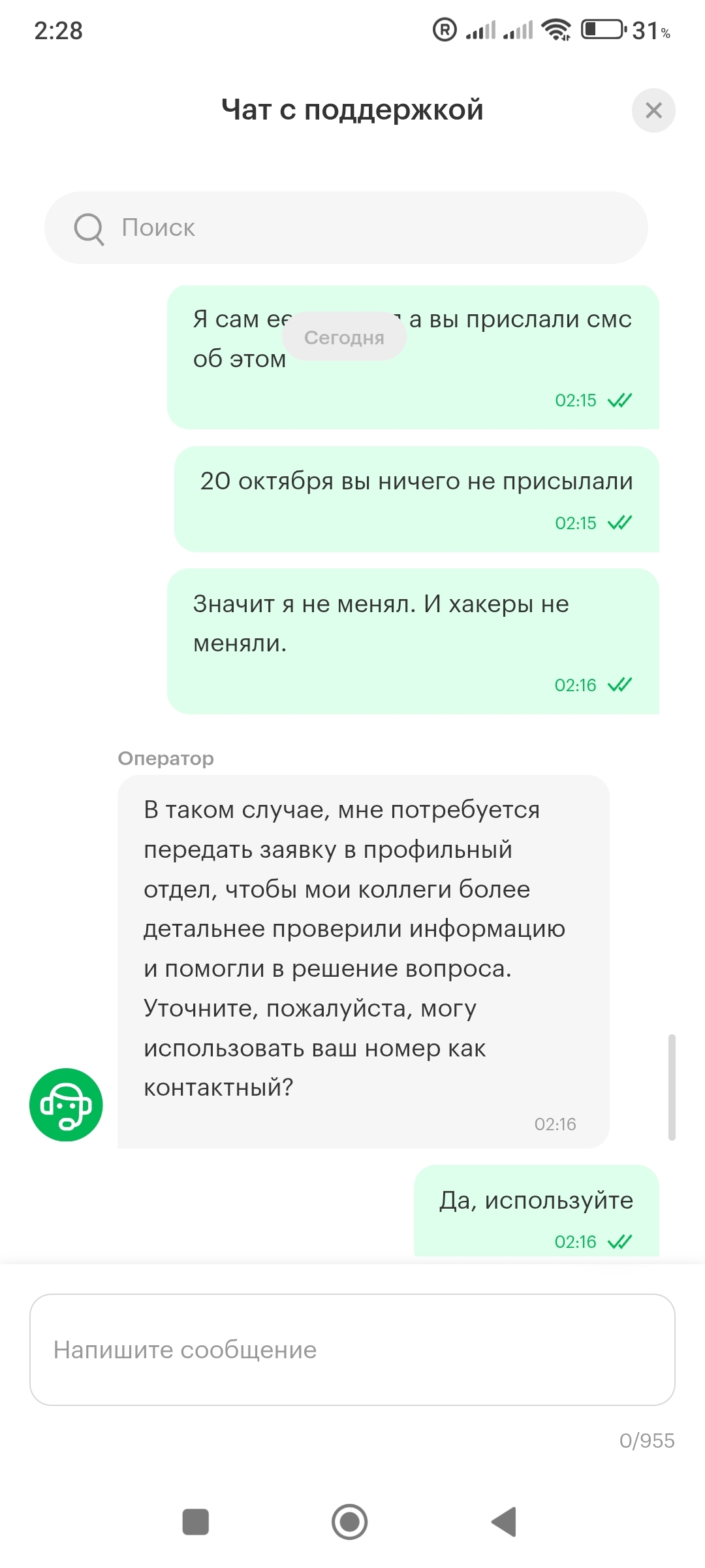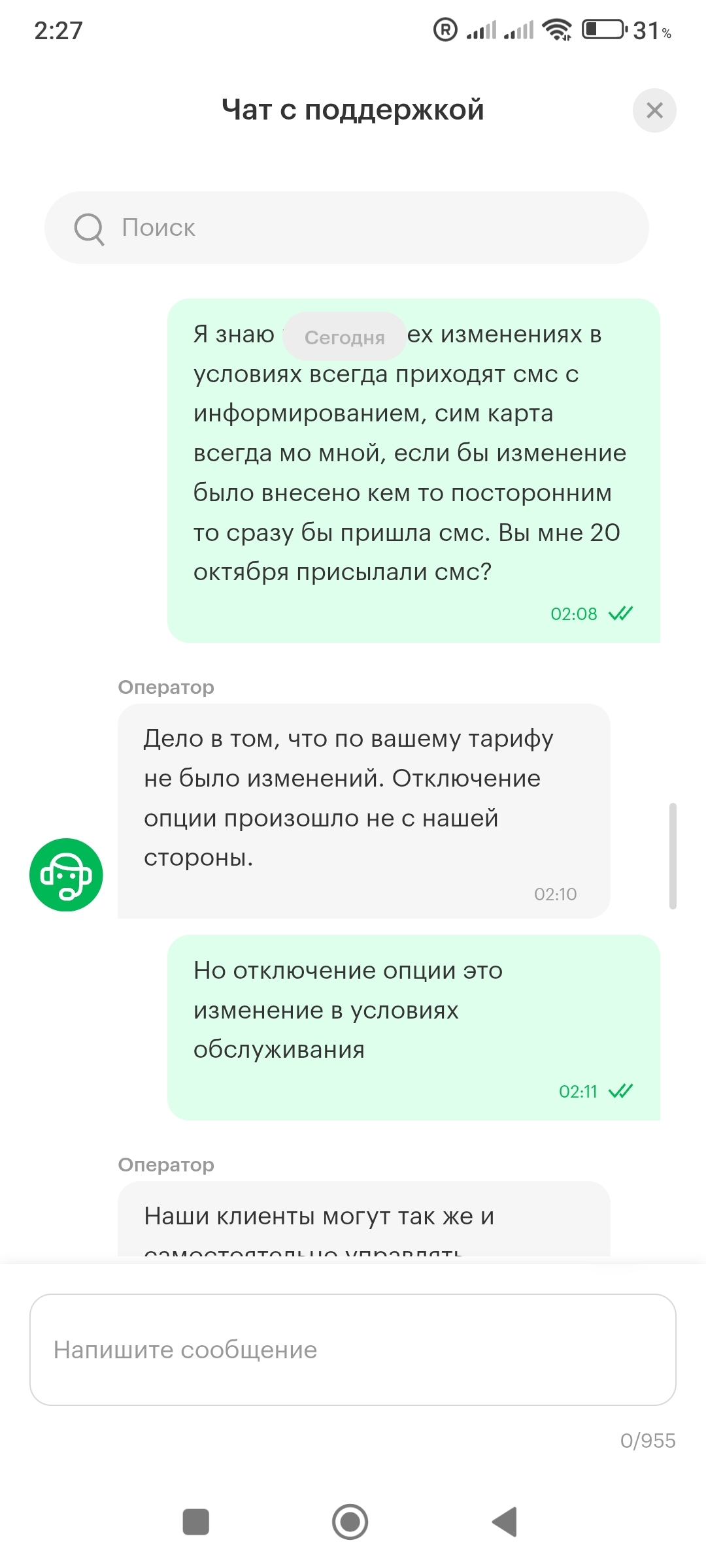 Я знаю что при всех изменениях в условиях всегда приходят смс с информированием, сим карта всегда со мной, если бы изменение было внесено кем то посторонним то сразу бы пришла смс. Вы мне 20 октября присылали смс?