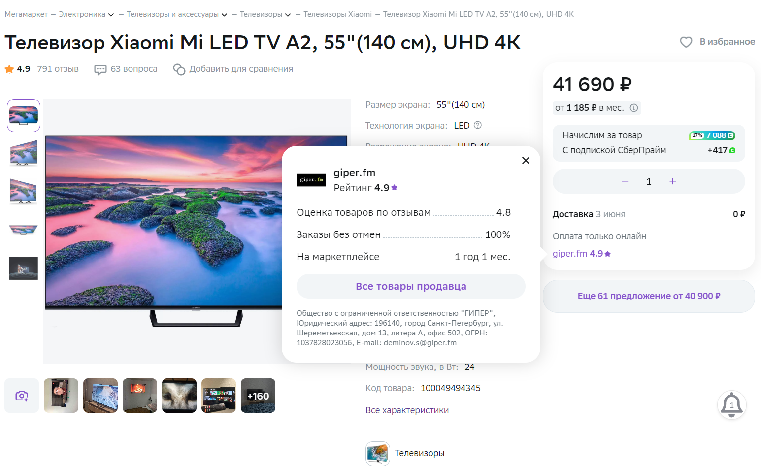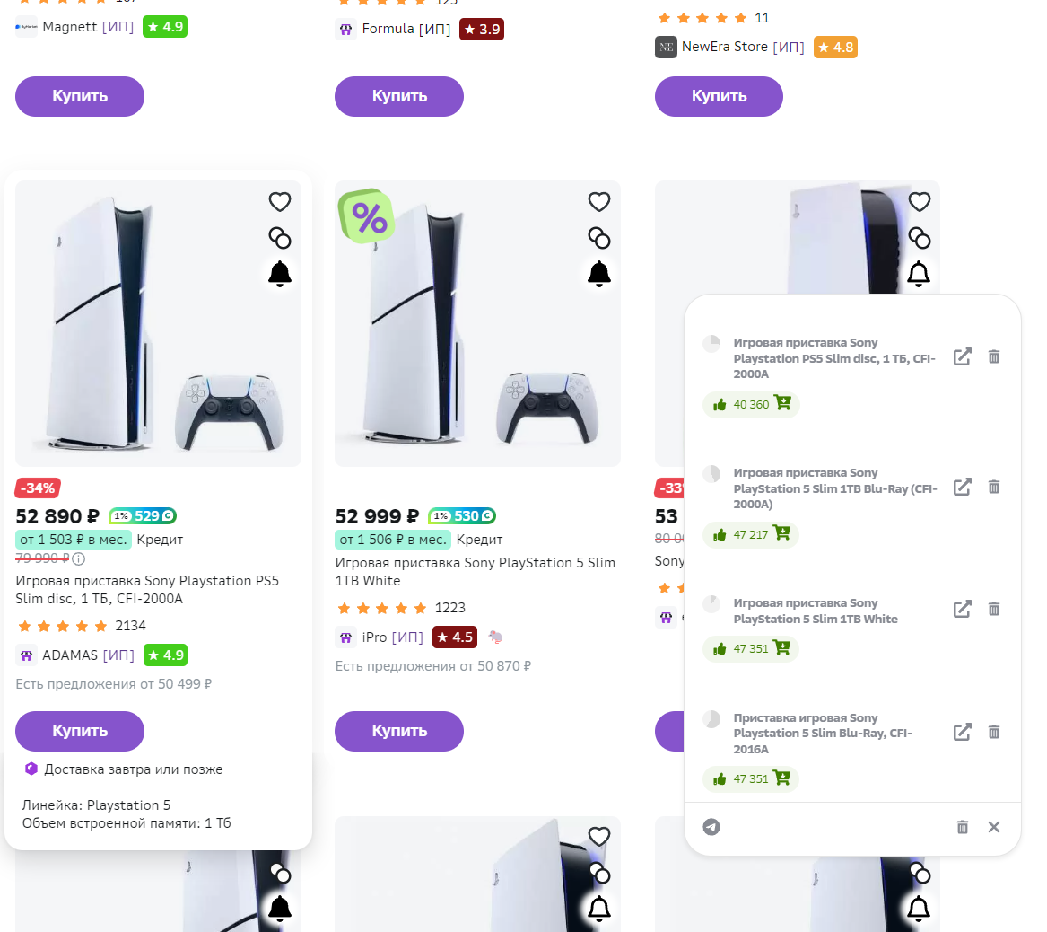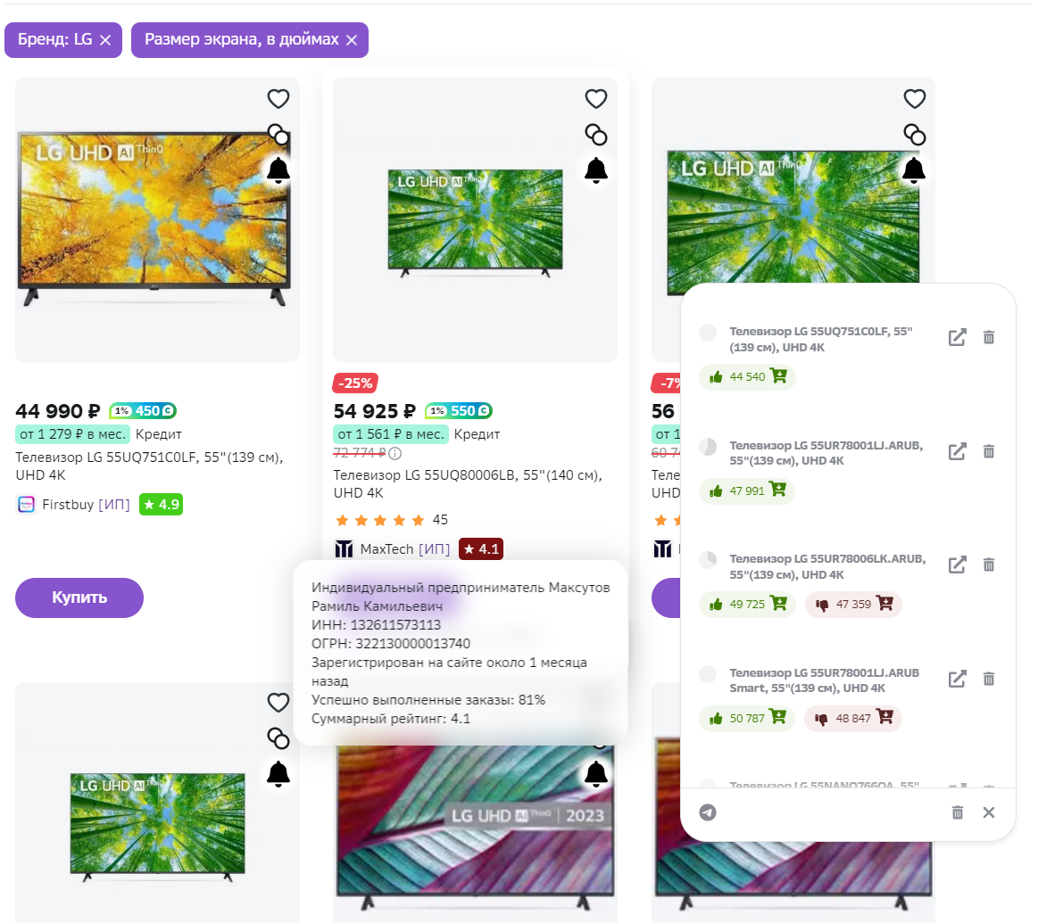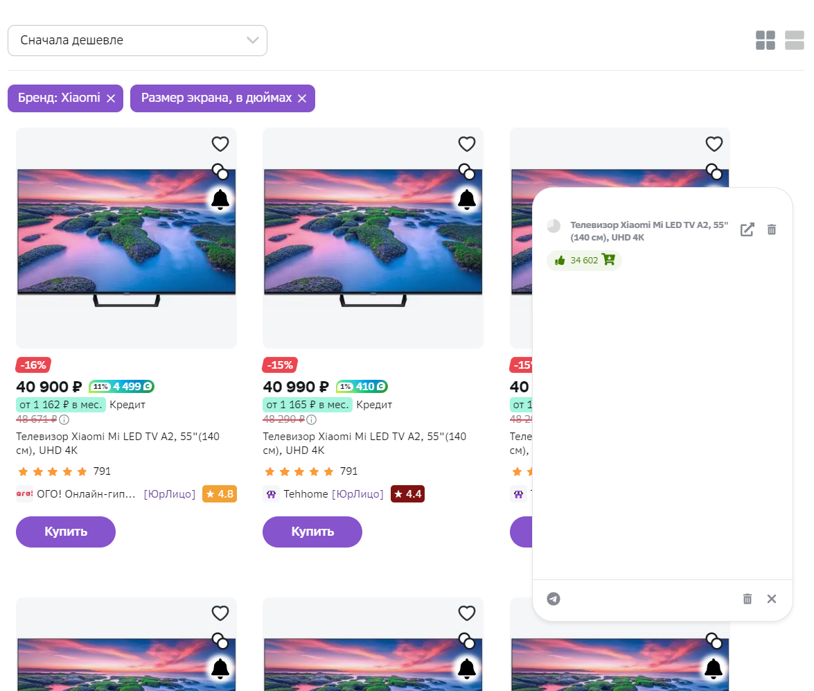 К примеру, хотим мы телик 55 дюймов от xiaomi. Смотрим самый дешевый. Смотрим, что нам предлагает мегамаркет. Добавляем товар в watch list. И о чудо, выходит, что есть более выгодное предложение.