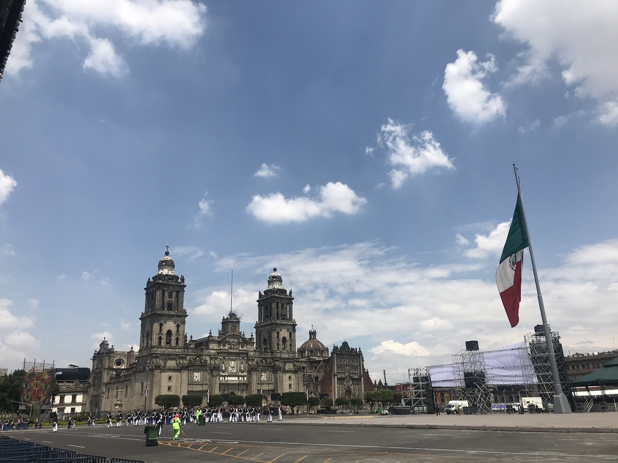Перво-наперво мы решили зайти в Собор Успения Богородицы, главный храм Мехико, благо он находился прямо напротив мини-отеля, где мы поселились. Собор был оцеплен солдатами, в церковном дворике стояли военные грузовики и бронетранспортёры. Там все еще шла утренняя месса. Собор был огромен и величественен, но при этом в нем чувствовалось тепло приходского храма, не музея. Внутри пахло ладаном и цветами. Удивительно, но Мексика как государство и национальная общность тепло хранит память именно своих доиспанских предков (я расскажу об этом подробнее чуть позже). Площадь Конституции, или просто Сокало – это та самая главная площадь стертого с лица земли Теночтитлана, столицы ацтеков. А кафедральный собор стоит на священном для ацтеков месте, где возвышалась огромная пирамида Уицилопочтли, украшенная черепами пленных воинов.