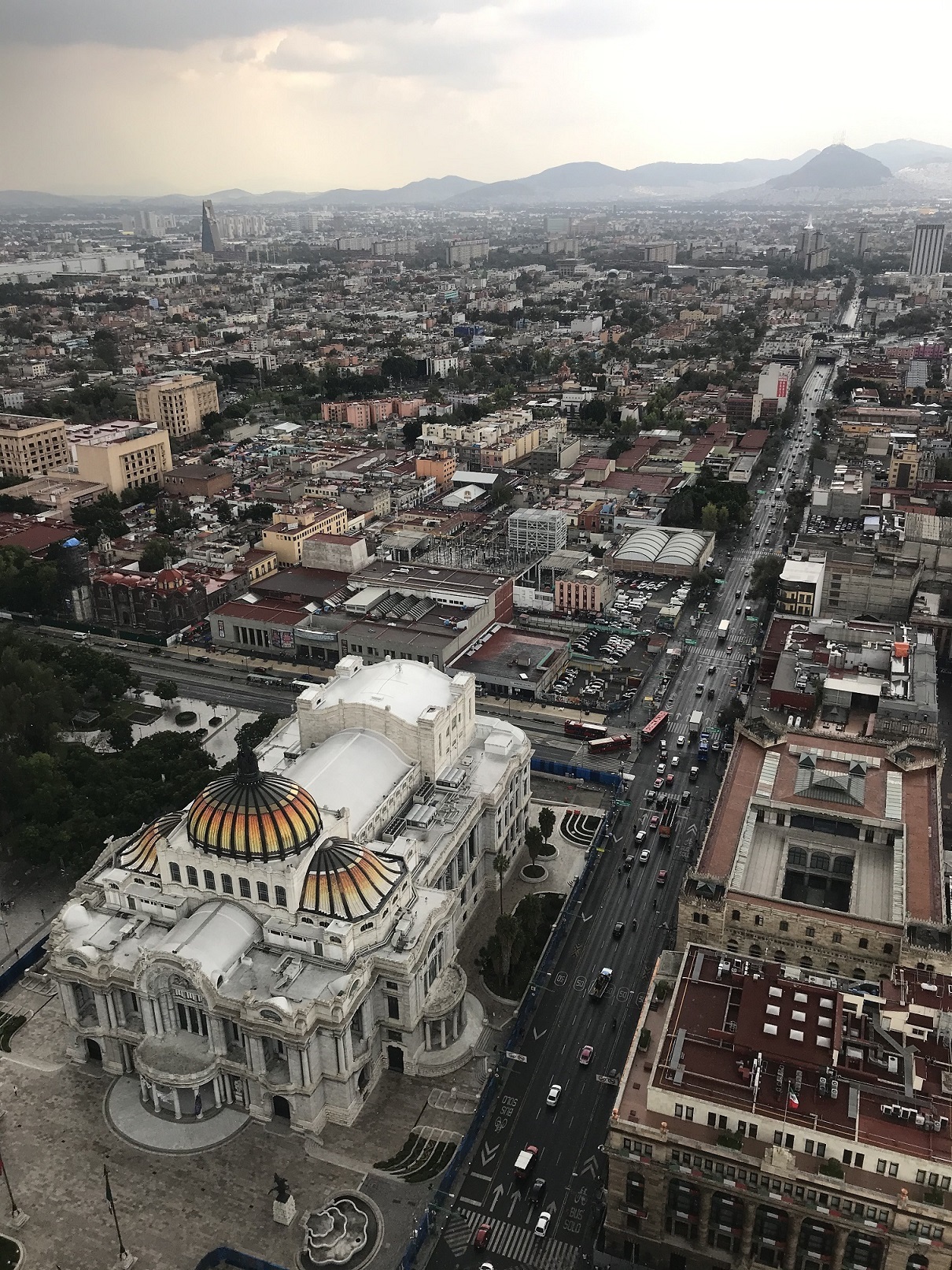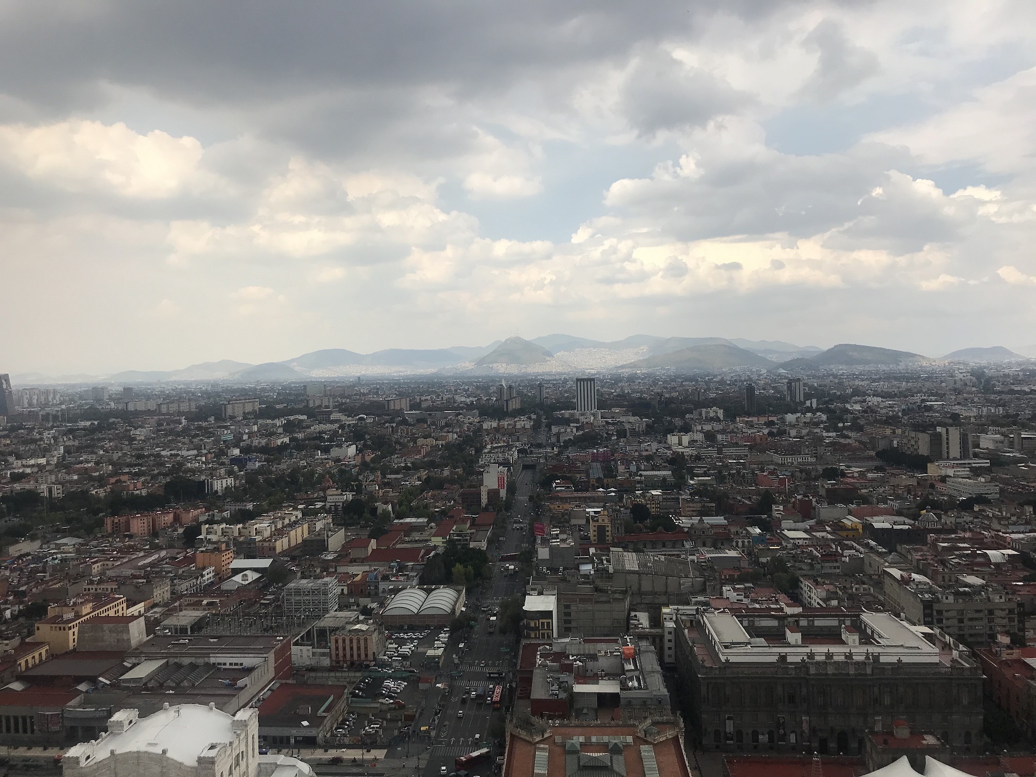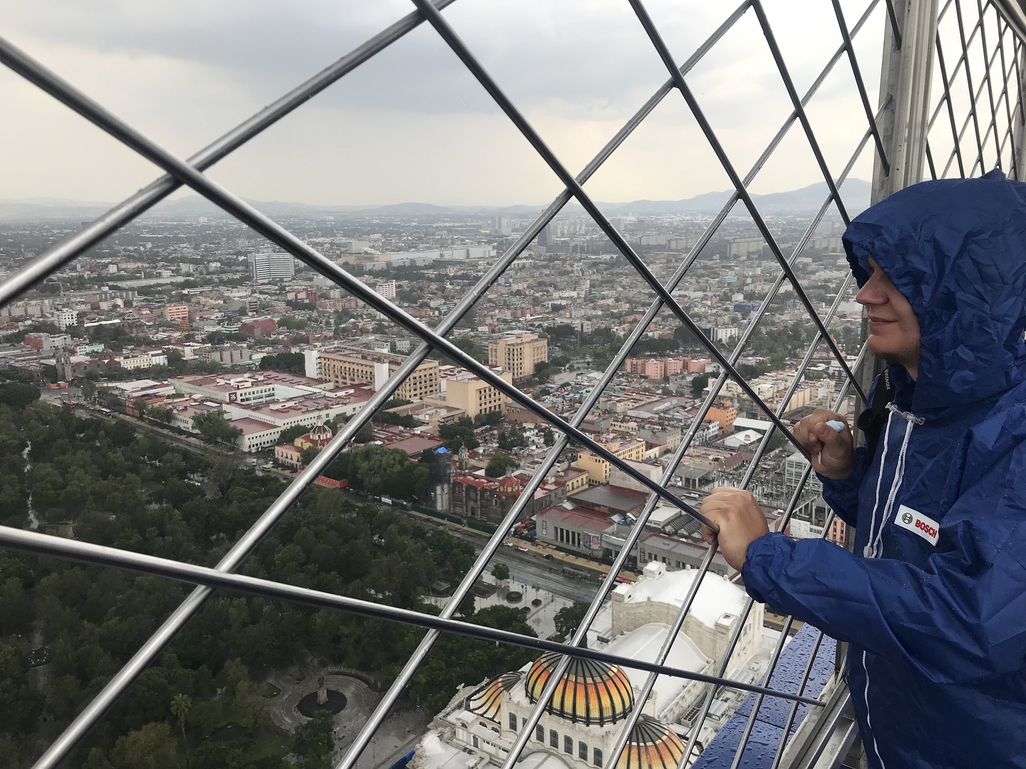 Наполняющуюся отовсюду прибывающими толпами народа площадь Сокало мы решили покинуть, отправившись пешком по заполненным людьми улицам до торчащего над крышами старинных зданий белого высокого ствола Латиноамериканской башни. Шестьдесят лет назад это было самое высокое здание Латинской Америки. Сейчас же и в самом Мехико есть небоскребы повыше, но к этому «дедушке» все равно стоит отнестись с уважением – хотя бы потому, что он пережил два чудовищных землетрясения (в 1957 и в 1985 годах) в 8 баллов, разрушивших все вокруг, и остался стоять по сей день без существенных повреждений. Мы поднялись наверх, на открытую смотровую площадку, где я сделал вот эти снимки: