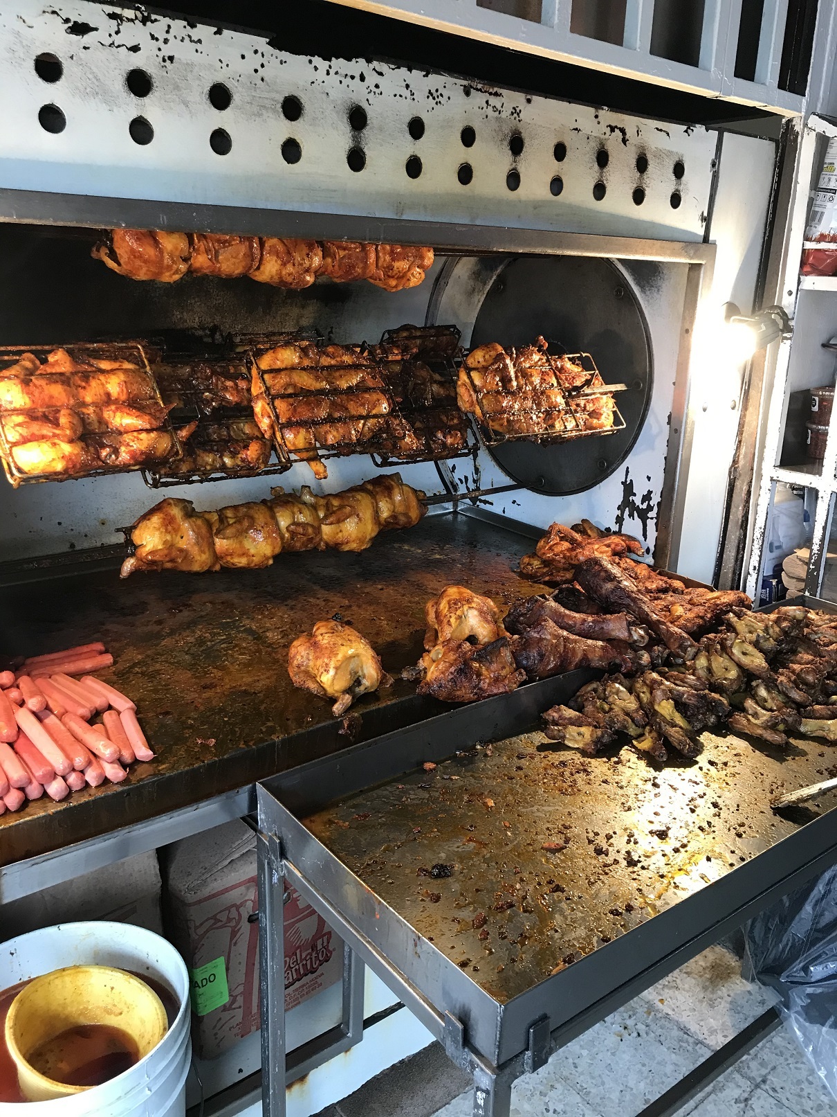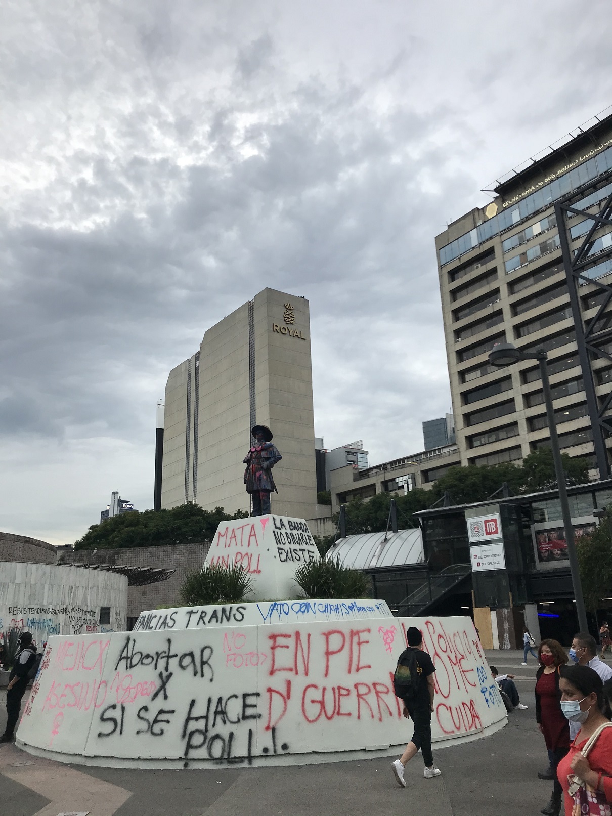 Сам город мне напомнил чем-то Москву самого начала девяностых – когда она еще была наполнена бетонно-серым скудным и лаконичным советским пост-ампиром, но уже разрешили уличную торговлю, аляпистые вывески и коммерческие ларьки. Удивило отношение мексиканцев к памятникам – все они изуродованы граффити, облиты ядовитого цвета краской. На улицах не грязно – нет, так, грязновато. Мы гуляли по центру, увидели крытый продуктовый рынок – и не могли не зайти. Внутри было шумно, людно, вонюче – как и на центральном рынке моего родного города в середине девяностых. На прилавках горы невиданных фруктов – гуанабана, гранадилла, карамбола, гуава, рамбутан, питайя, черимойя, саподилла. В прозрачных, подсвеченных лампочкой кубах из плексигласа, похожих на те, в которых у нас продают попкорн – широченные лепехи жареной во фритюре свиной кожи, любимое тут лакомство. Вонища непередаваемая!
