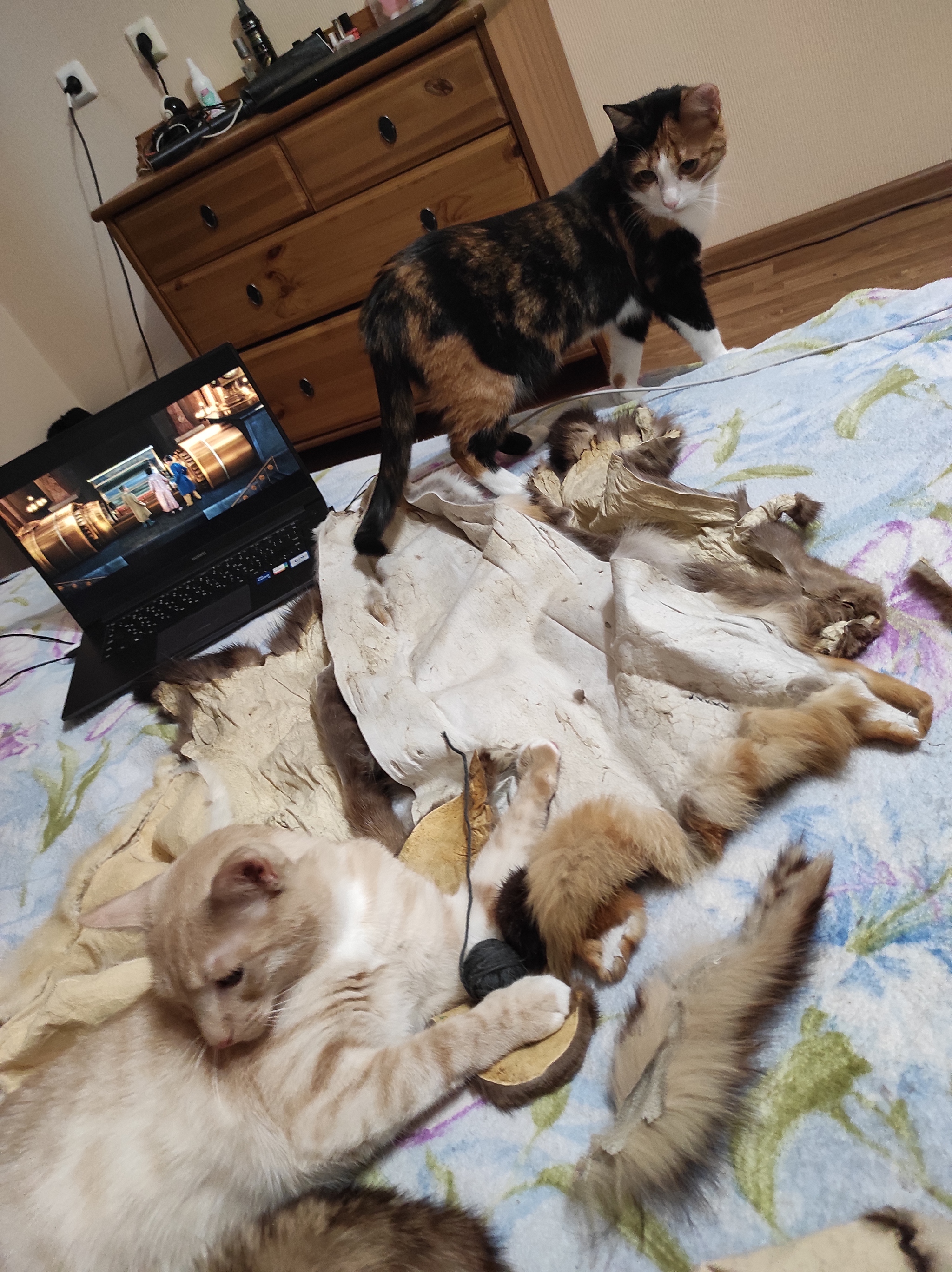 Лежало у меня в закромах пару шкурок норки, лиса, кусочки песца, да пара шапок непонятного происхождения, то ли нутрия, то ли выдра. И надоел мне этот склад давно, всё думала - выкинуть, отдать может кому или что то придумать. Решила в итоге котикам плед сделать.