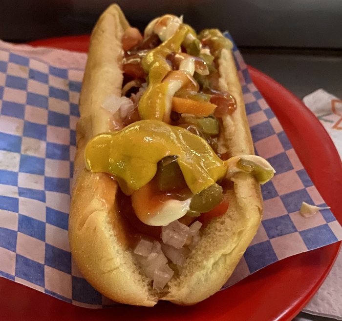 Обычно такие прицепы притараканивают с помощью авто, или просто откатывают куда-то в сторону, где цепями приматывают к какой-нибудь нерушимой хуиболе стационарной конструкции, чтобы никто не скоммуниздил честно нажитое имущество. Вопреки моим предположениям, что питаются в этих генераторах диареи передвижных кибитках исключительно студенты и нищеброды, сколько бы раз я не подходил, чаще всего встречал в очереди людей приличного достатка, о чём смело можно было судить по машинам, из которых они подходили к точке фастфуда. А вот так выглядит хотдожная, где можно выбрать 7 вариаций сосисок (попробовал все, все были вкусны и различались заметно) и кучу топпингов, стоимость ход дога от 30 до 55 песо.