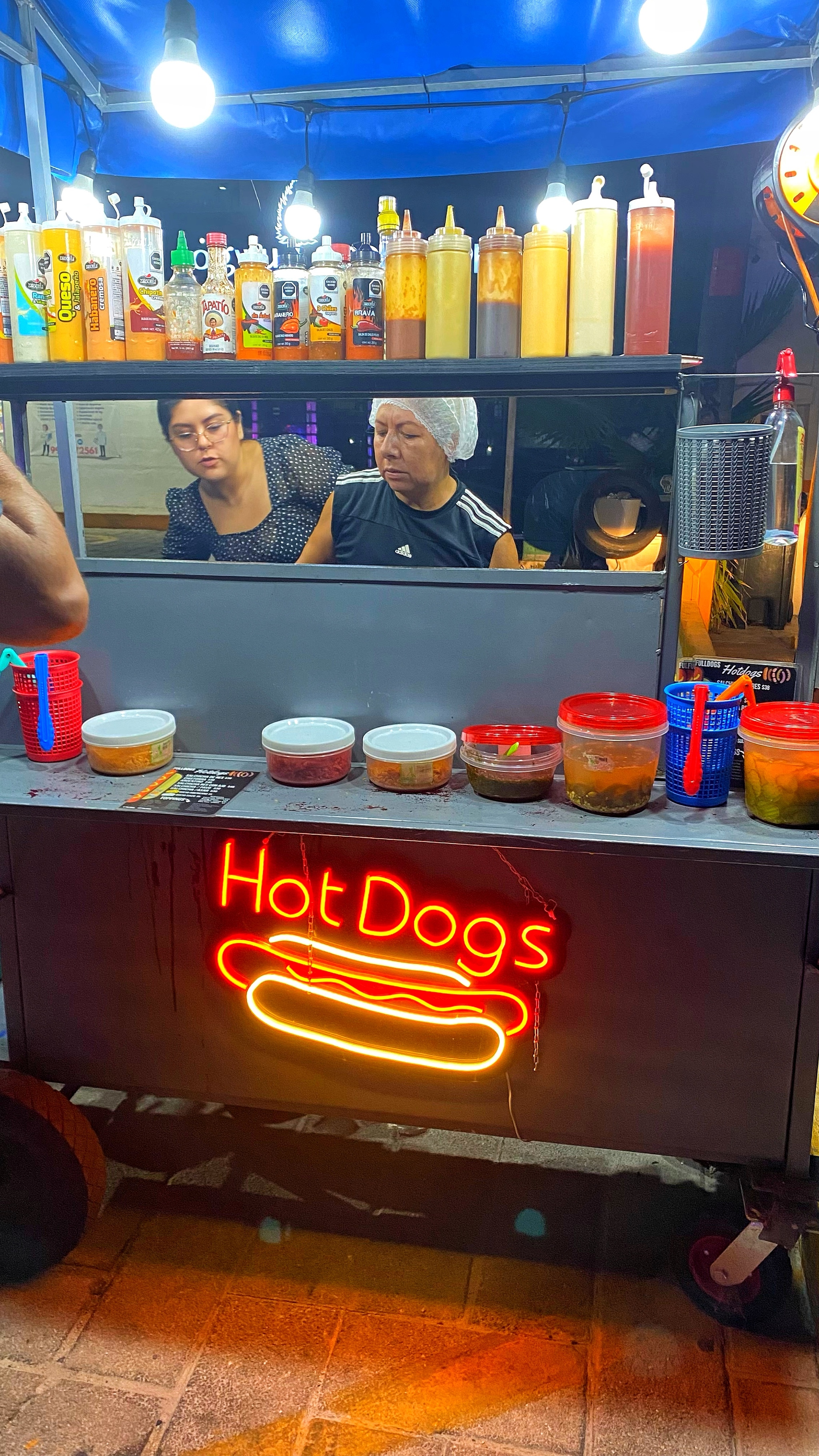 К слову, превратить часть своего дома или какое-то нежилое помещение в забегаловку - путь достаточно сложный. Но не по факту реальной сложности, а по причине наличия более простых решений. Как только наступают сумерки и диск раскалённой звезды по имени Солнце скрывается за горизонтом, отовсюду выползают они - кровопийцы и вурдалаки передвижные ларьки и прицепы для готовки! И их тоже достаточно много, но распределяются они весьма равномерно. Я не видел, чтобы 2 таких передвижных кухни находились на расстоянии меньше чем 200-300 метров. Что их отличает от домашних заведений? Антисанитария, волосы в тарелке, повар незаметно плюёт в блюдо Разнообразие вкусов, рецептов и невероятная дешевизна! Типичный хот-дог из такой уличной забегаловки, который стоит 30 песо (~100 рублей). Двумя такими я, бог-император здоровый дядька в 99 килограмм нездорового веса, наедаюсь более чем: