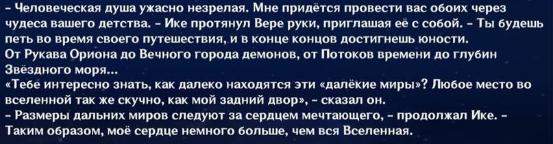 Небо — огромная ложь, созвездия и звёзды, что находятся над Тейватом, не те звёзды, про которые мы знаем, а всего лишь скопления воли, желаний и мечт своего хозяина.