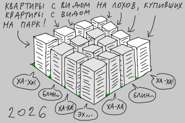 так и есть, а ещё первому дому обещают большую стоянку, магазин рядом, садик обещают построить вот вот и школу в доступности. а в итоге получаем муравейник и кучу агрессии от соседей т.к. машину приткнуть негде.