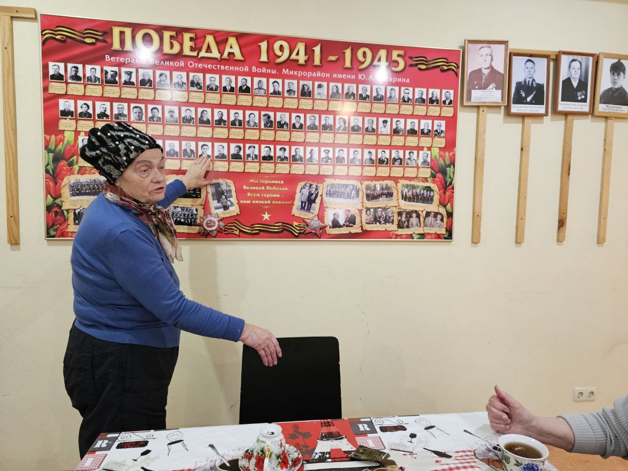 Именно такая «стена памяти», но с фотографиями фронтовиков размещена в основном помещении некоммерческой организации «Фонд поддержки ветеранов Великой Отечественной войны и ветеранов трудового фронта «Защита»».