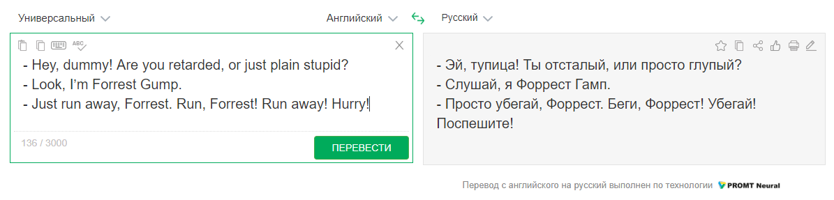 В начале десятых годов интернет взорвали шуточные видео – отрывки фильмов, которые были переведены с английского на русский с помощью машинного перевода. Идея аудитории понравилась, и ее подхватили интернет-пользователи, которые тоже начали публиковать видео со смешными переводами. Хайпом воспользовались даже некоторые компании - в ПРОМТ, например, запустили свою серию вирусных роликов – самым популярным стал перевод отрывка из "Форреста Гампа".