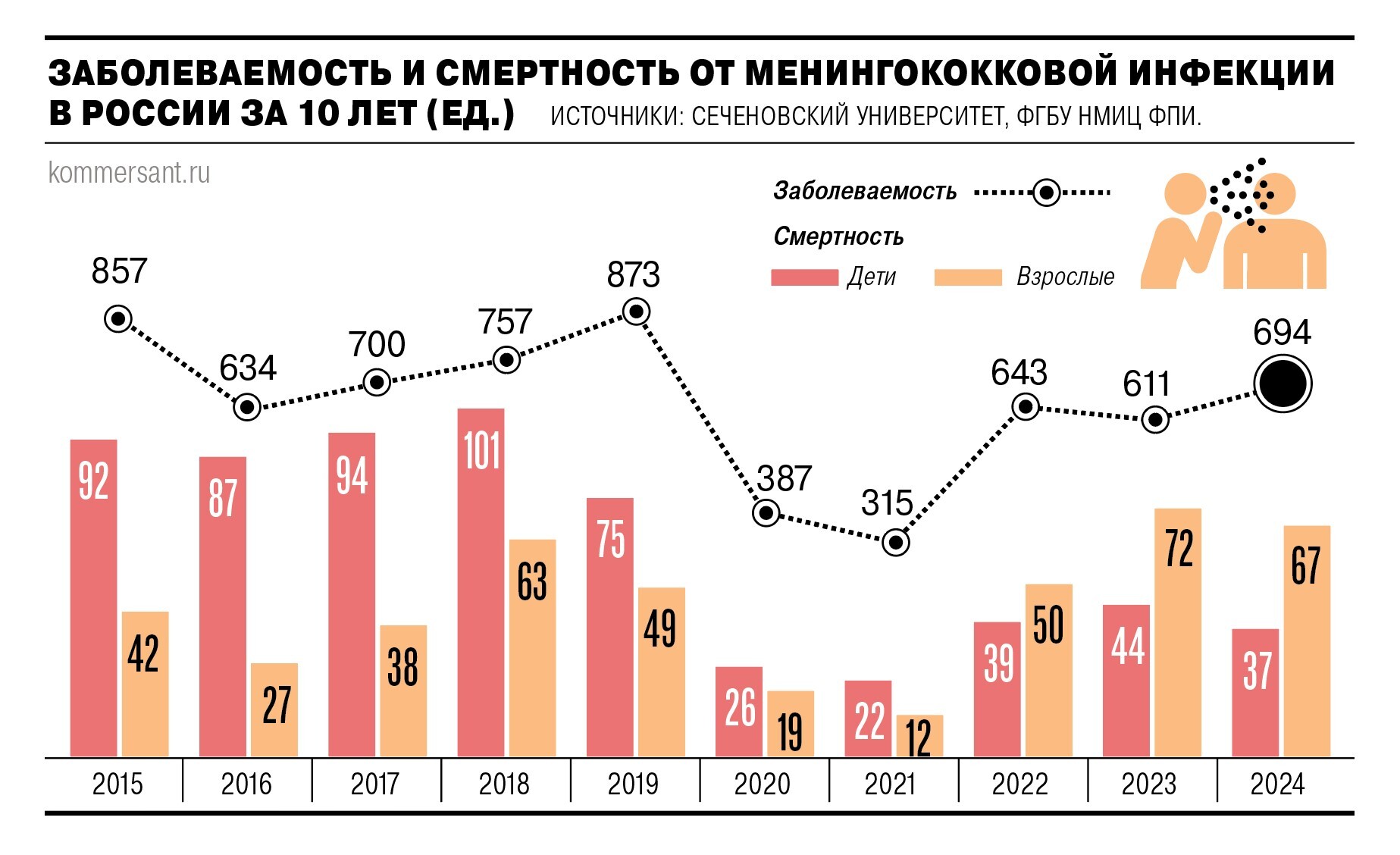 В 2025 году за пять месяцев было выявлено 124 ребенка и 698 взрослых с менингококком. При этом впервые заболеваемость среди взрослых на 100 тыс. населения оказалась выше, чем заболеваемость среди детей. «С точки зрения детского населения мы потихоньку справляемся. Но вторая часть проблемы — мигранты — это вопрос риторический,— посетовал господин Ртищев.— Хотя в хостелах, где были выявлены очаги, проводилась вакцинация. Но миграционные потоки — это меняющиеся группы людей. И вакцинация одной из них не приведет к долгосрочным последствиям». По словам врача, в такой ситуации не стоит ждать положительных изменений.
