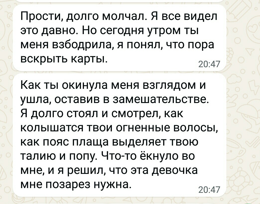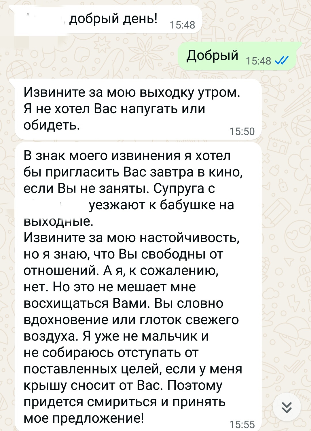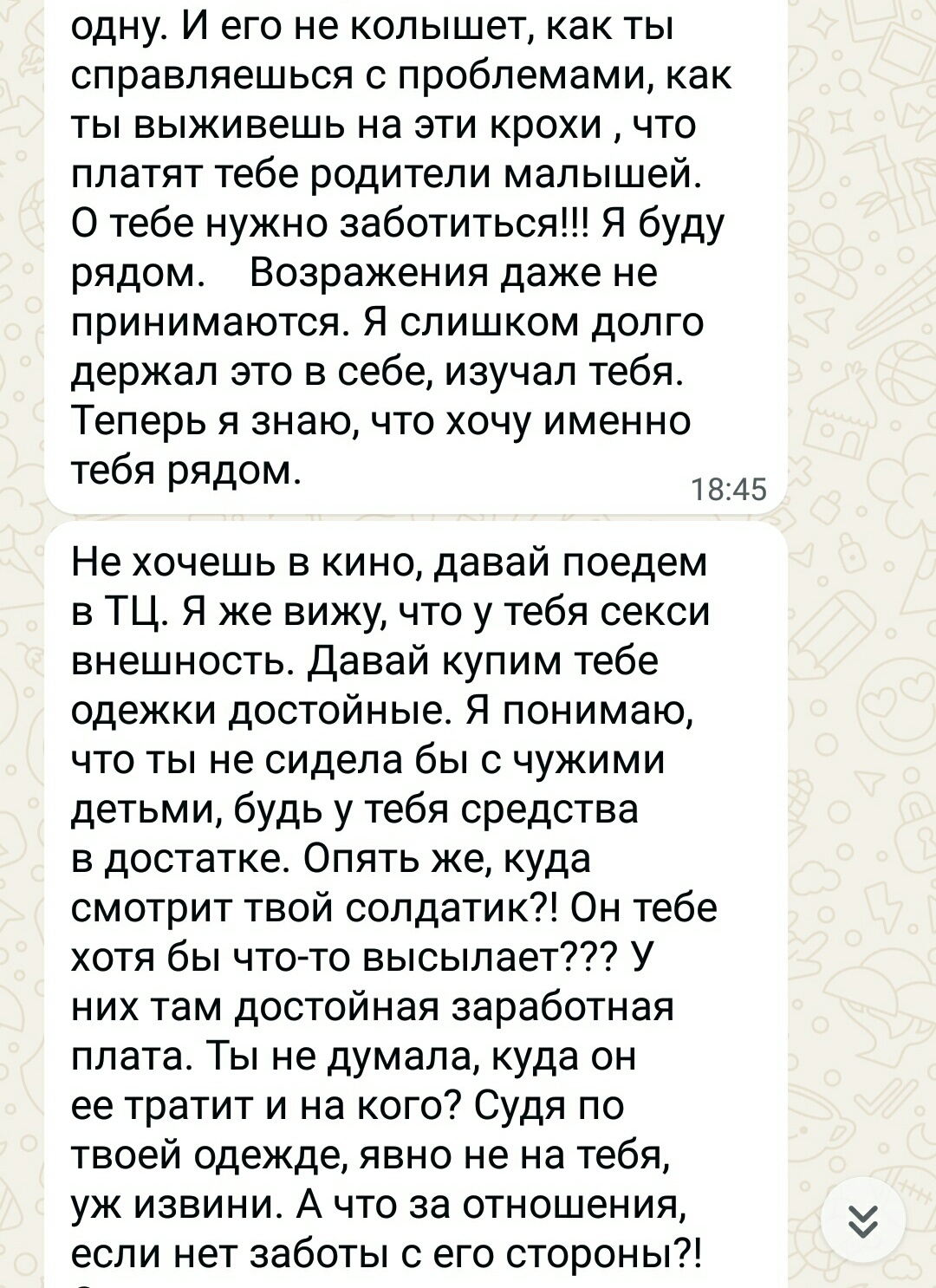 К концу рабочего дня начинается "жара". Просто какой-то "водопад" односторонних сообщений от этого папаши. Причем с каждым сообщением содержание становится смелее. Сначала было извинение за утренний случай, затем предложение сходить в кино, т.к. "жена и сын уезжают на выходные к бабушке", и он уверен в том, что я не состою в отношениях. Напрямую заявляю ему, что у меня есть молодой человек, который сейчас на сво, и если, он не прекратит это все, то переписка уйдет к жене.