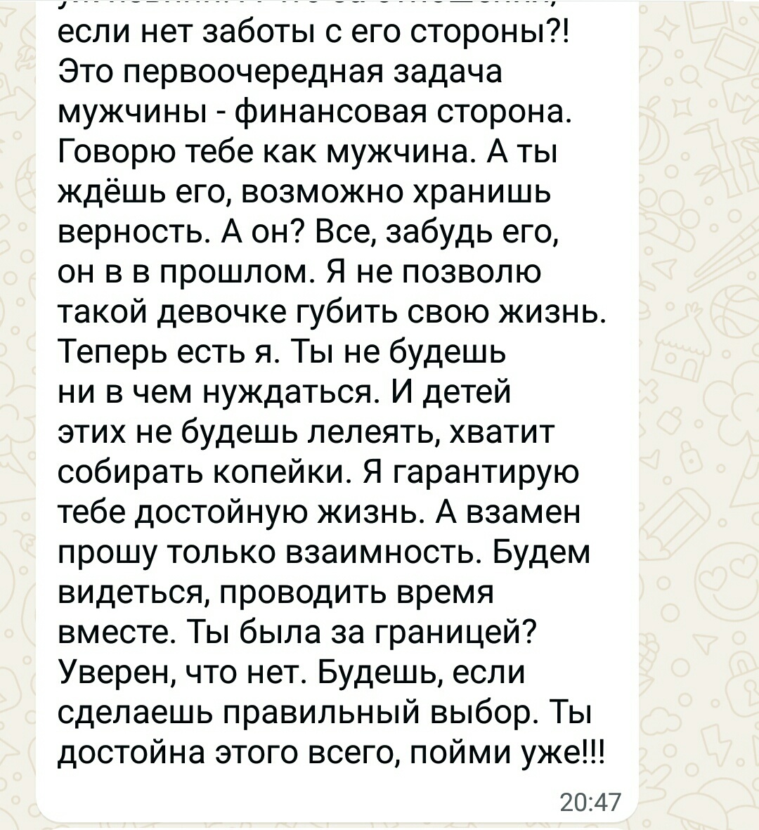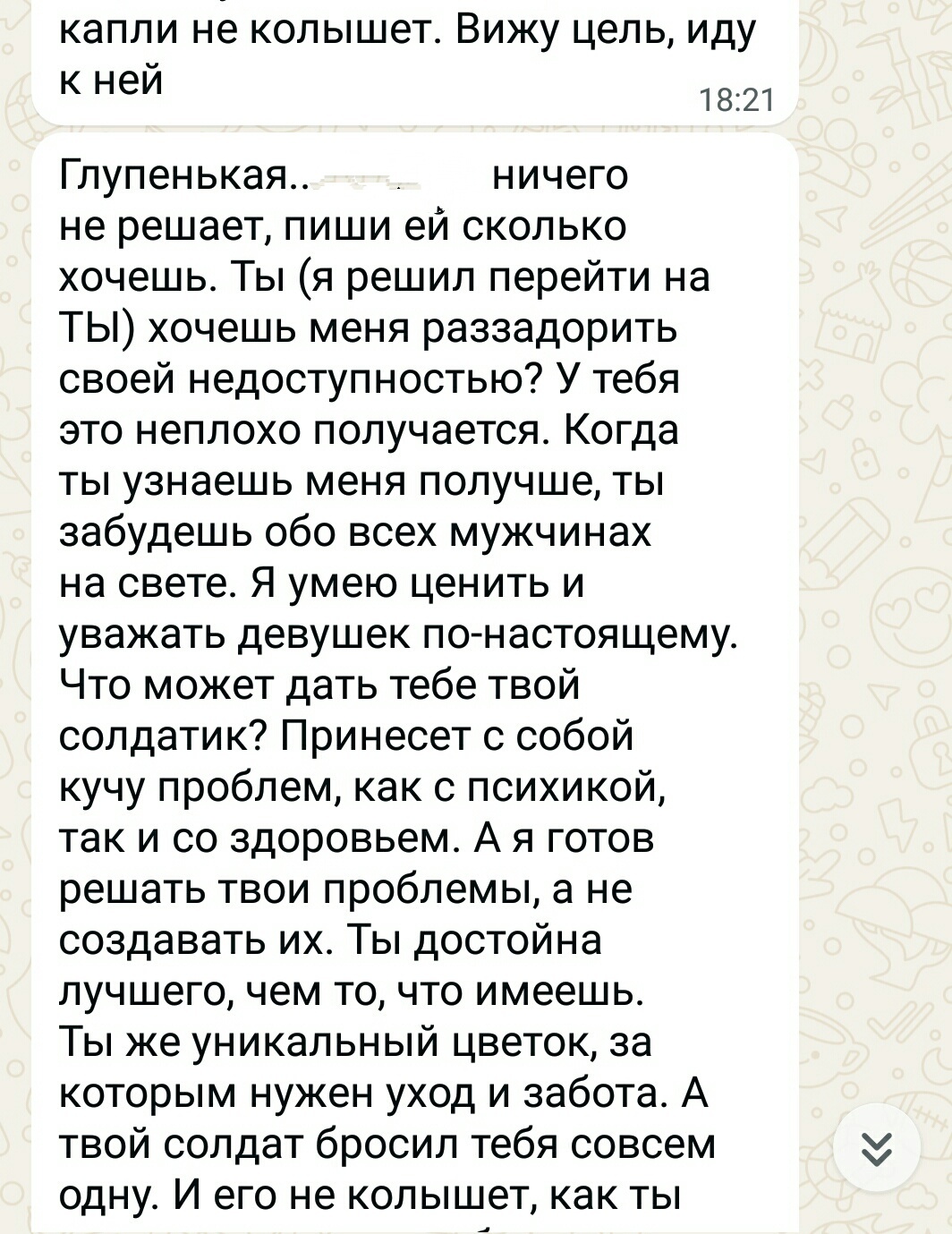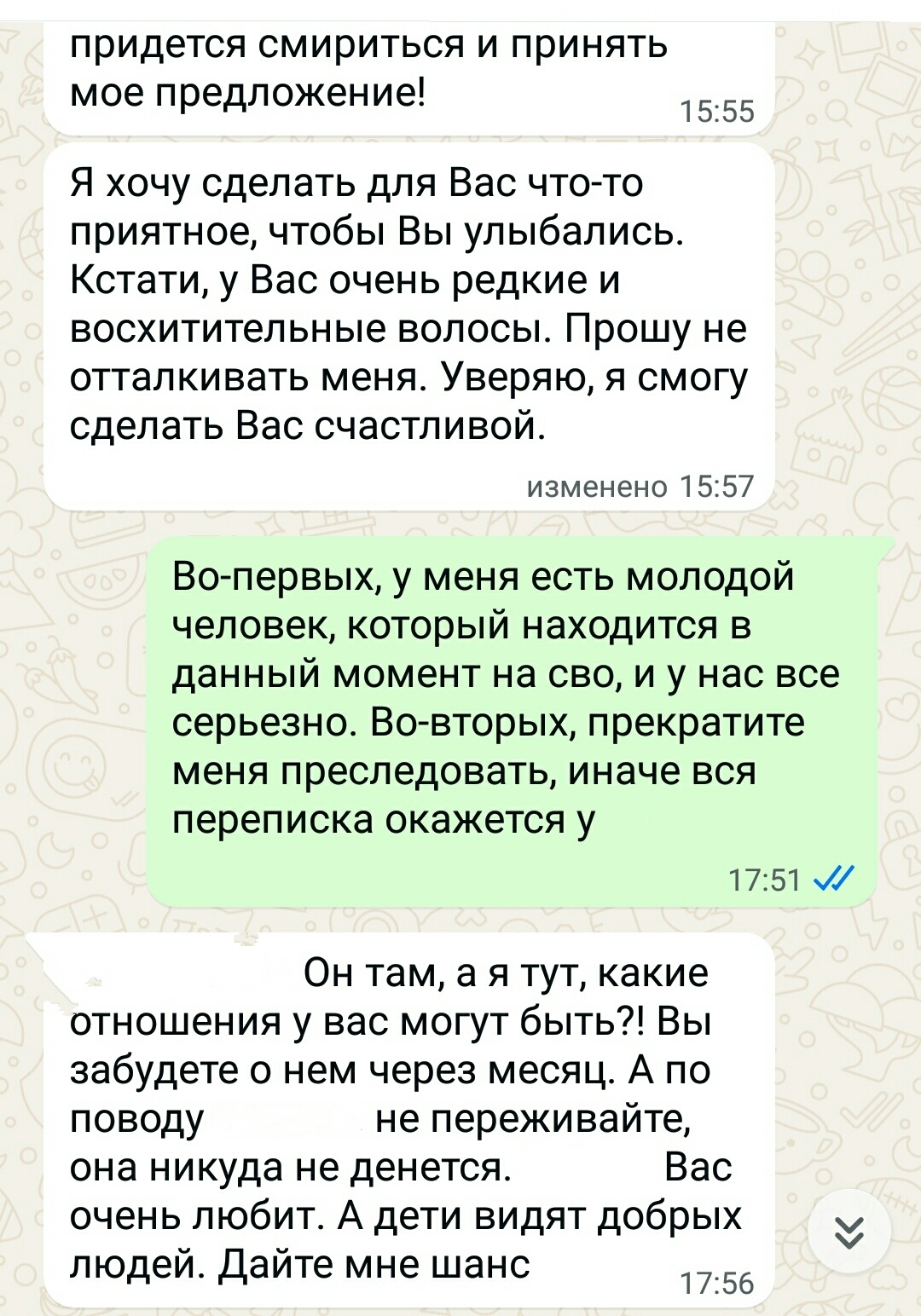 К концу рабочего дня начинается "жара". Просто какой-то "водопад" односторонних сообщений от этого папаши. Причем с каждым сообщением содержание становится смелее. Сначала было извинение за утренний случай, затем предложение сходить в кино, т.к. "жена и сын уезжают на выходные к бабушке", и он уверен в том, что я не состою в отношениях. Напрямую заявляю ему, что у меня есть молодой человек, который сейчас на сво, и если, он не прекратит это все, то переписка уйдет к жене.