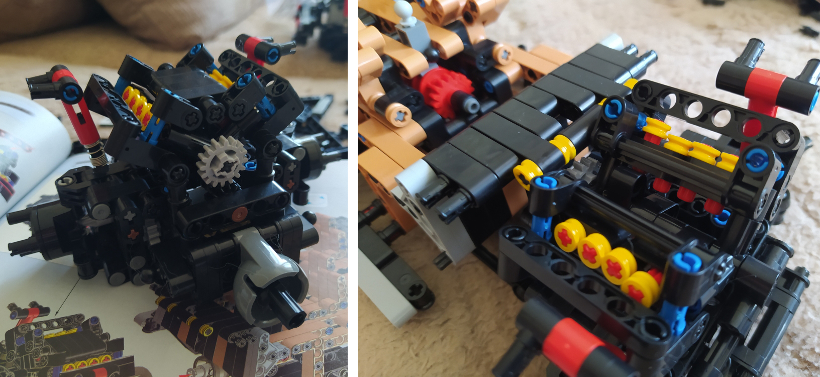 Следом идет двигатель. Он устанавливается на передний мост и вешается через, уже знакомое нам сферическое соединение к коробке передач. Если внимательно посмотреть на левое фото, видно, что двигатель сверху прикрыт крышкой, я её не стал устанавливать, чтобы была видна работа коленвала в двигателе.