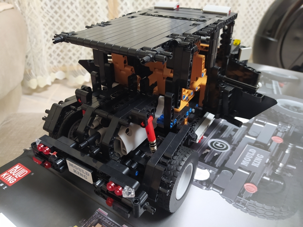 Наконец машина собрана! Выглядит классно. Надо сказать, что сама модель не играбельна в полном смысл этого слова - это стендовый образец, она катается, внутри прыгают цилиндры, вращаются шестерни, включаются-отключаются мосты, поворачиваются колеса в общем полное ознакомление с устройством внедорожника.