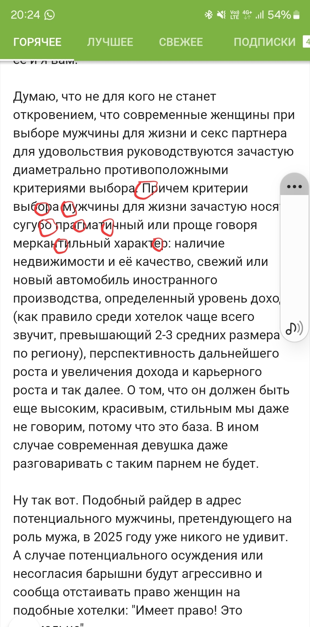Ну так вот. Подобный райдер в адрес потенциального мужчины, претендующего на роль мужа, в 2025 году уже никого не удивит. А случае потенциального осуждения или несогласия барышни будут агрессивно и сообща отстаивать право женщин на подобные хотелки: "Имеет право! Это нормально".