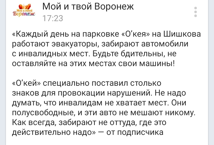15 horyfree Места для инвалидов 2 года назад Из одного местного паблика Инвалид Парковка Скриншот Воронеж Штрафстоянка 3 Ещё 0