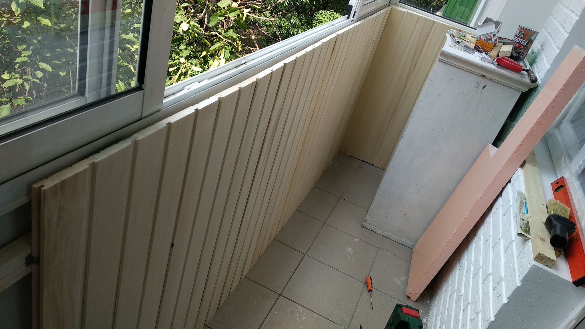 С обрешеткой я провозилась целый день, потому что хотелось сделать ровно. Совершенно кривой балкон сопротивлялся как мог, но я победила) Поэтому с вагонкой особых проблем не возникло. Метровая как раз вставала по высоте как нужно. А с помощью кляймеров крепить оказалось проще простого.