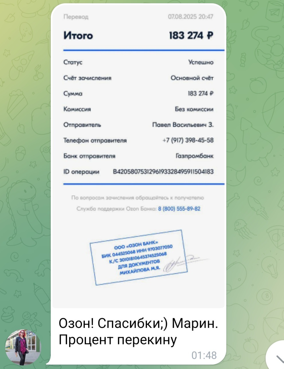 Один раз в чат закинули еще одного лоха избранного, девушка задала вопрос "что за чат и чем тут занимаются", из постоянных ей ответили - "читай закреп. Мы здесь деньги зарабатываем". Она сразу вышла, высказав своё недоверие. Сейчас и следов этой переписки в чате не осталось.