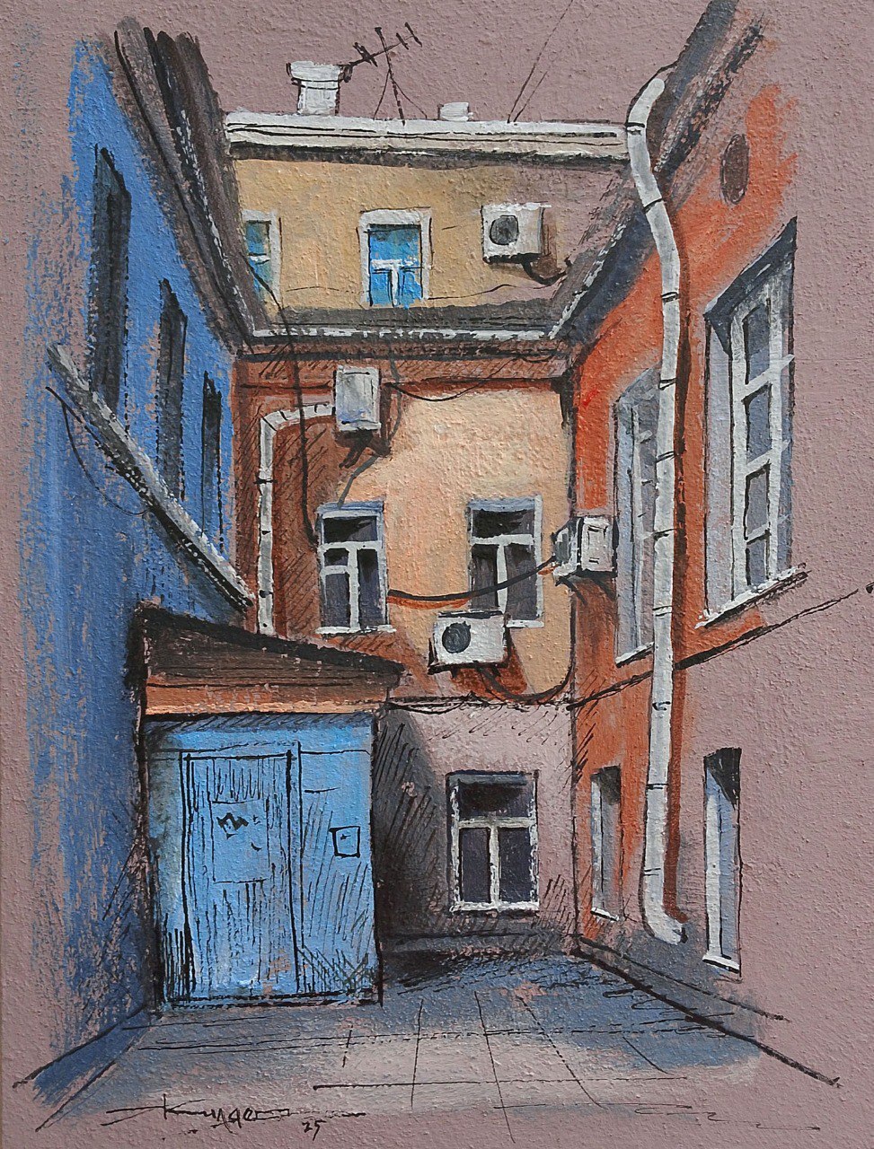 Отзываясь нелестно об акриле, называют свойства краски, такие как декоративность, плакатность, односложность цветовой гаммы. Работая с акрилом более 20 лет, я знаю, что это не так и материал имеет широчайший спектр возможностей. Сегодня я не буду спорить со скептиками, а возьму на вооружение их аргументы. Давайте напишем картину плакатно и декоративно, превратив названные недостатки акрила в его преимущество. Создавая работу, я применил однородно тонированный фон, подкрашивал плоскости локально, без оттенков цвета. Тени дополнялись линейной штриховкой тонкой кистью. Получилась хорошая альтернатива маркерному скетчу. Такую картину можно покрыть лаком и вставить в раму без стекла. Акрил — краска светостойкая, дополнительная защита не требуется. Мне кажется, что акрил достойно прошел еще одно испытание в новой технике.