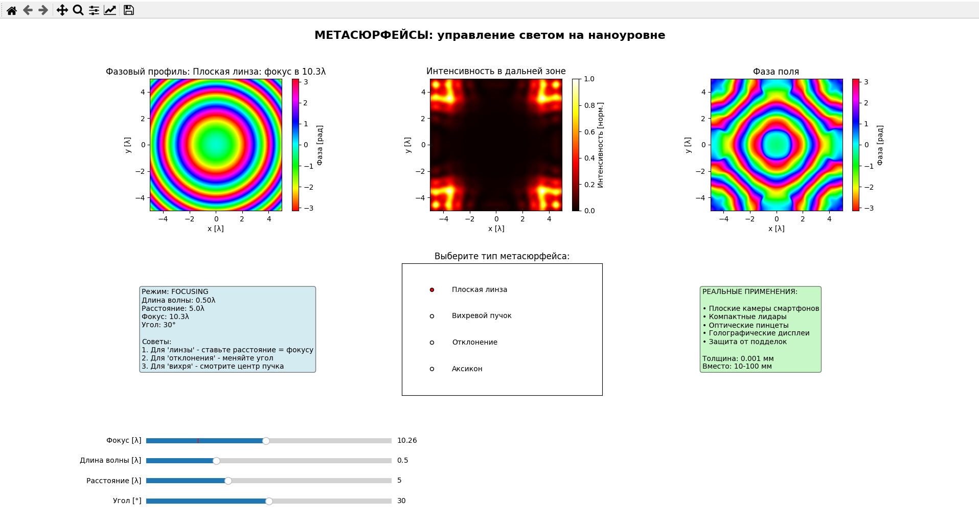 Модель создана на основе принципов, описанных в обзорных статьях по метасюрфейсам, Capasso et al., Nature Nanotechnology, 2018
