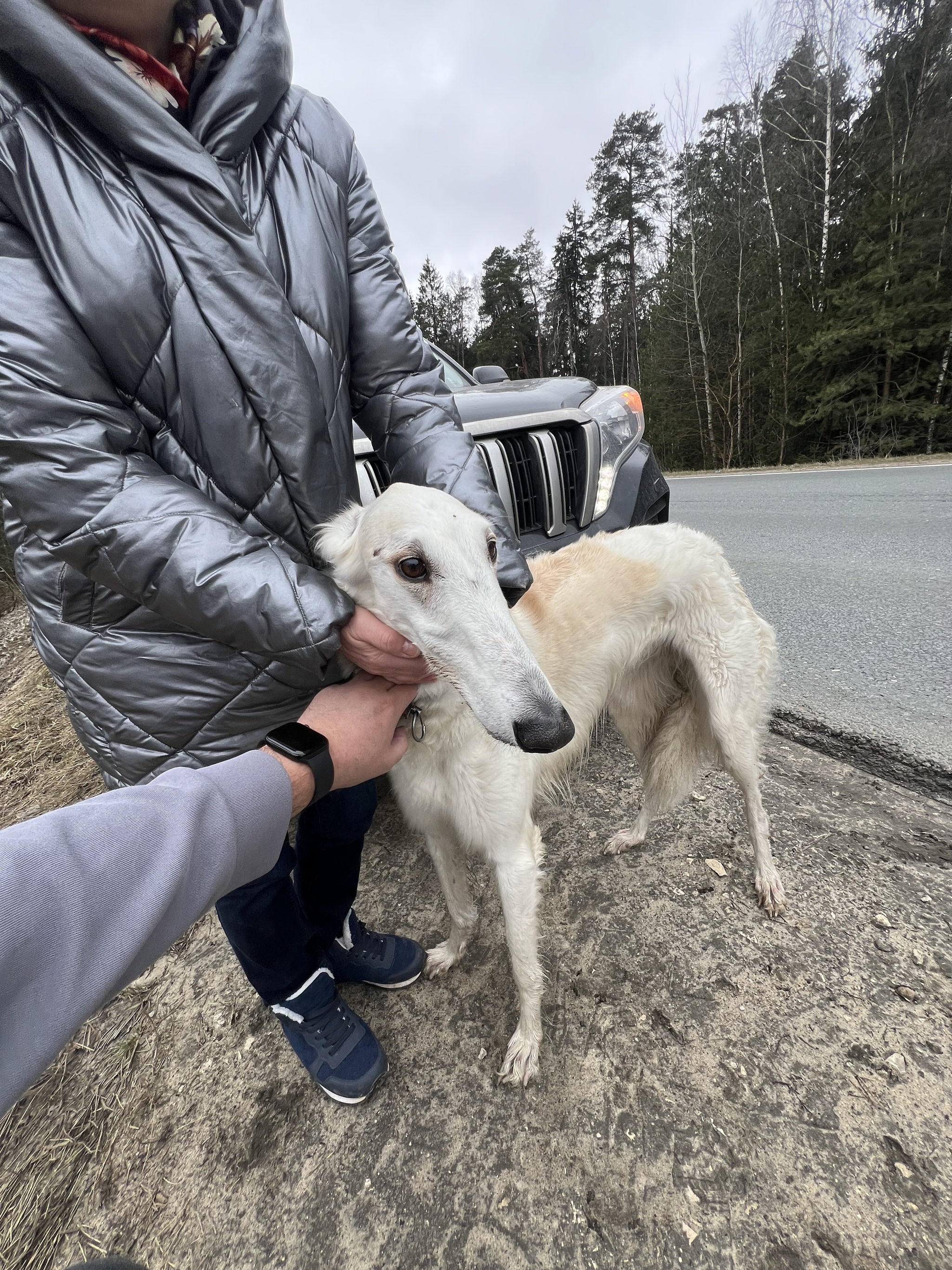 Вчера возвращался с дачи. Движение не спешное, дороги еще не сильно загружены, относительно лета. Боковым зрением промелькнула на встречной обочине светлая живность. А мама с пассажирского сидения вещает: «ничего себе, это же борзая. Они же домашние, что она тут делает одна?». Метров через 50, принимаю решение развернуться и проверить собаку. Пропускаю несколько машин и при возможности разворачиваюсь. Дорога не очень широкая, но умещаю разворот в один заход. Что бы не спугнуть животное, медленно съезжаю на обочину и останавливаюсь примерно в 10 метрах, включаю «аварийку». В голове разные мысли, ведь не знаешь как собака может отреагировать на чужих людей. Начинаю с ней разговаривать. Вроде не убегает, двинулась в мою сторону, но вышла на дорогу. Подняв руку вверх я вышел на проезжую часть, остановил движение попутки. Собака подошла ближе, но обошла меня и уткнулась в дверь машины. На шее широкий ошейник, вышитый бисером. Ясно, девчонка у нас))). Все равно немного боязно, но беру ее за ошейник, агрессивной реакции нет. Тяну- упирается. Одной рукой беру ее под грудную клетку и оттаскиваю с дороги. Поддается, уходим на обочину. В глазах страх, вздрагивает от проезжающих машин. Хвост поджат, просто стоит и смотрит в одну точку. На ощупь нахожу капсулу, но это карабин для поводка. Изучаю ошейник дальше, кручу его на шее собаки и нахожу заветный жетон с гравировкой. Звонок…