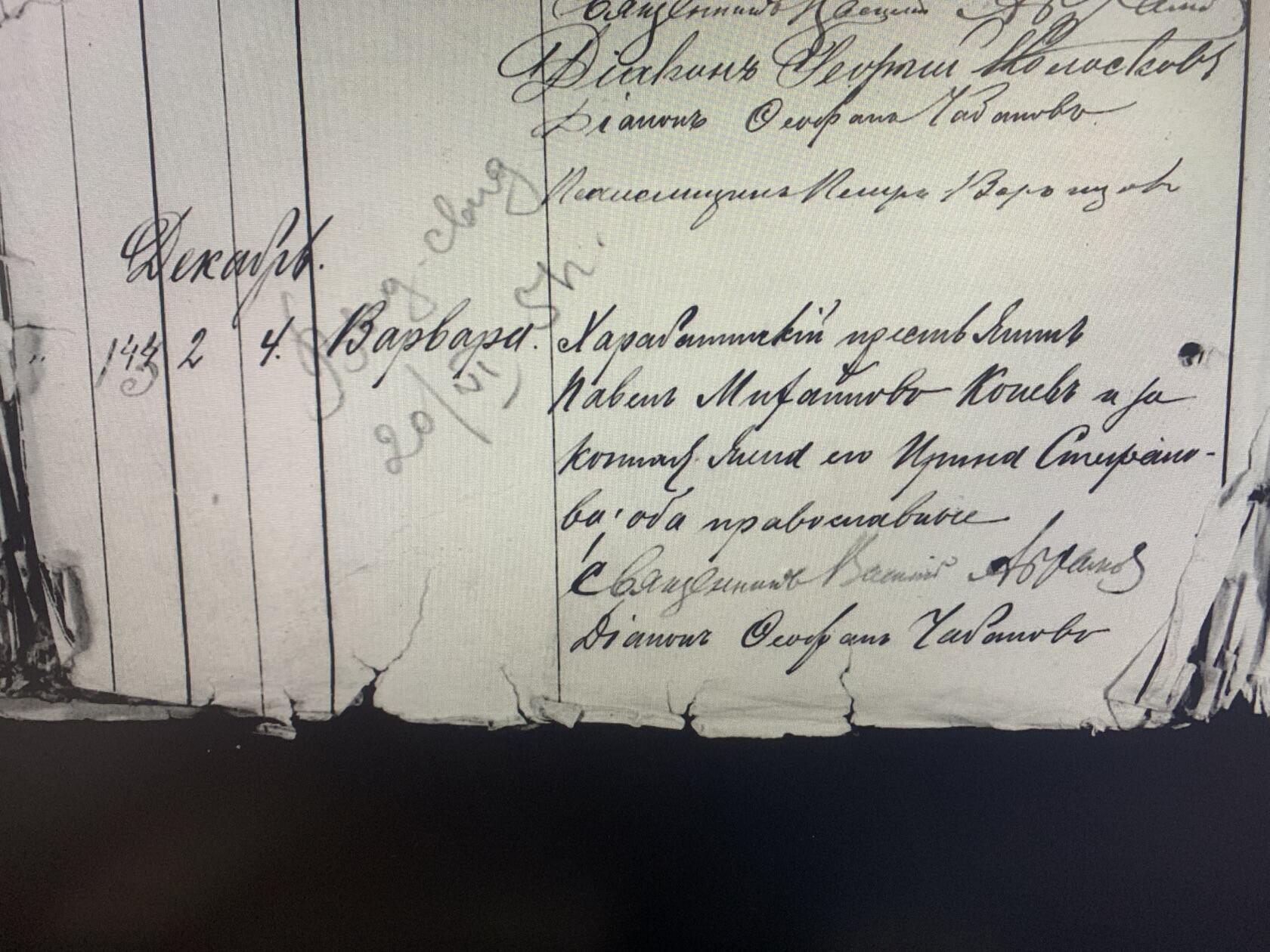 Изучаю метрические книги о своей малой родине. Нашёл запись о рождении своей прабабушки Варвары. Не могу прочитать отчество ее мамы Ирины. Отец Павел Михайлович Конев, его законная жена Ирина Спиридоновна? Просьба помочь в определении.