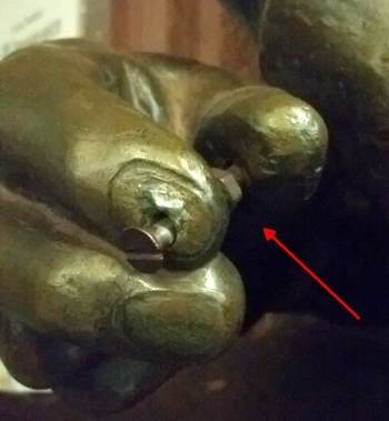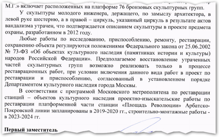 Мне ответили из мэрии Москвы (форма обращения: mos.ru/feedback) по поводу поврежденных скульптур инженера на станции метро Площадь революции. Оказывается, в руке у скульптуры инженера (работы Манизера М.Г.) находился циркуль, но его похитили вандалы!