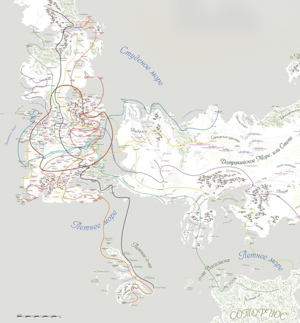 При этом дизайнер не отрывался и от реальной географии Вестероса и большинство локаций на схеме расположены именно в соответствии с картами этой страны и ее окружения. Вот так Rosto отобразил линии метро, нанесенные на вымышленный мир писателя Джорджа Мартина, по мотивам книг которого снимается сериал.