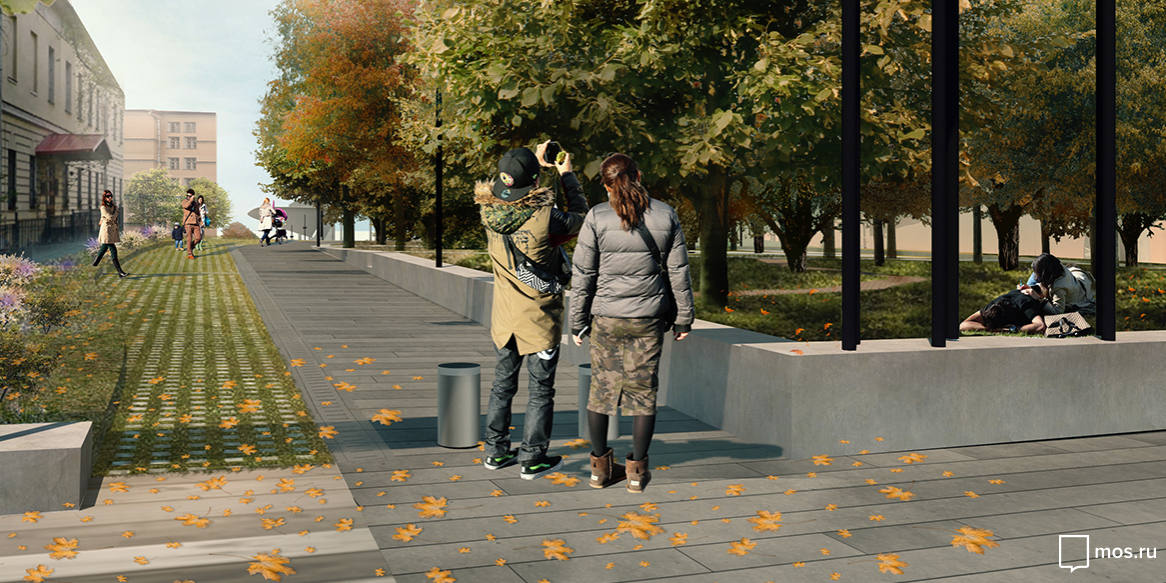 Там установят перголу волнообразной формы, скамейки, создадут смотровую площадку с видом на парк Горького и площадку для временных выставок и арт-объектов музея современного искусства «Гараж». Также здесь обустроят смотровую площадку. К парку будет вести лестница с пандусом в виде зигзага.