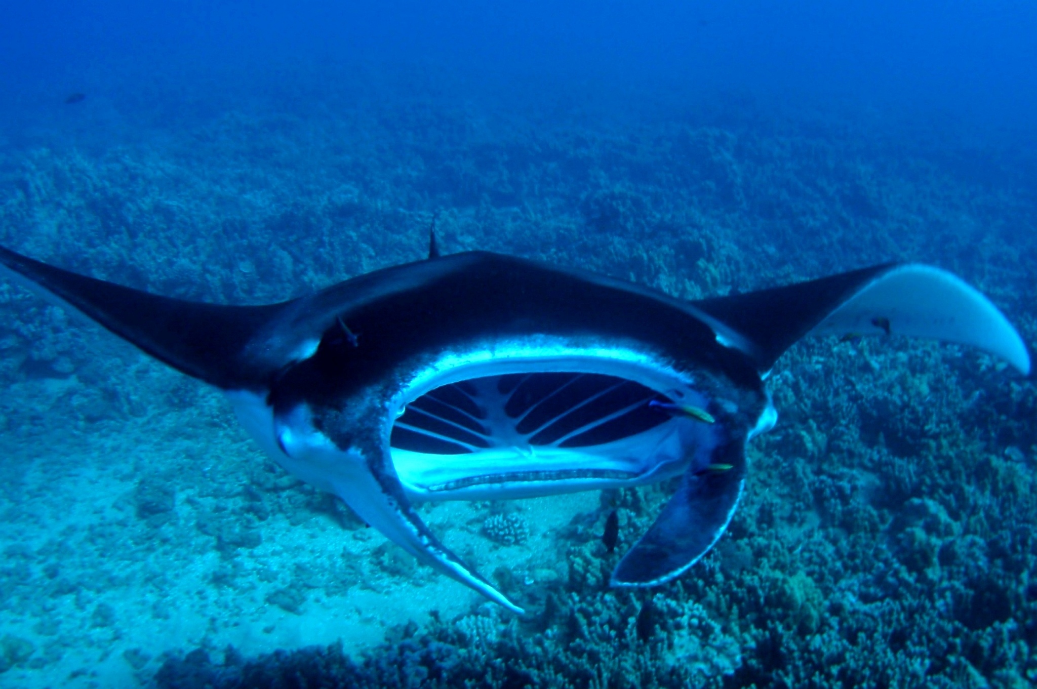 А на самом деле морской дьявол – одно из безопаснейших существ. Нет ни шипов, ни электричества, ни жутких зубов, удлиненный хвост-плеть ничем не вооружен. И характер незлобный, даже добродушный. На людей не нападают вообще. Да и двигается манта грациозно, неторопливо, даже флегматично, скорее – парит, летит, машет крыльями. Завораживающее зрелище…