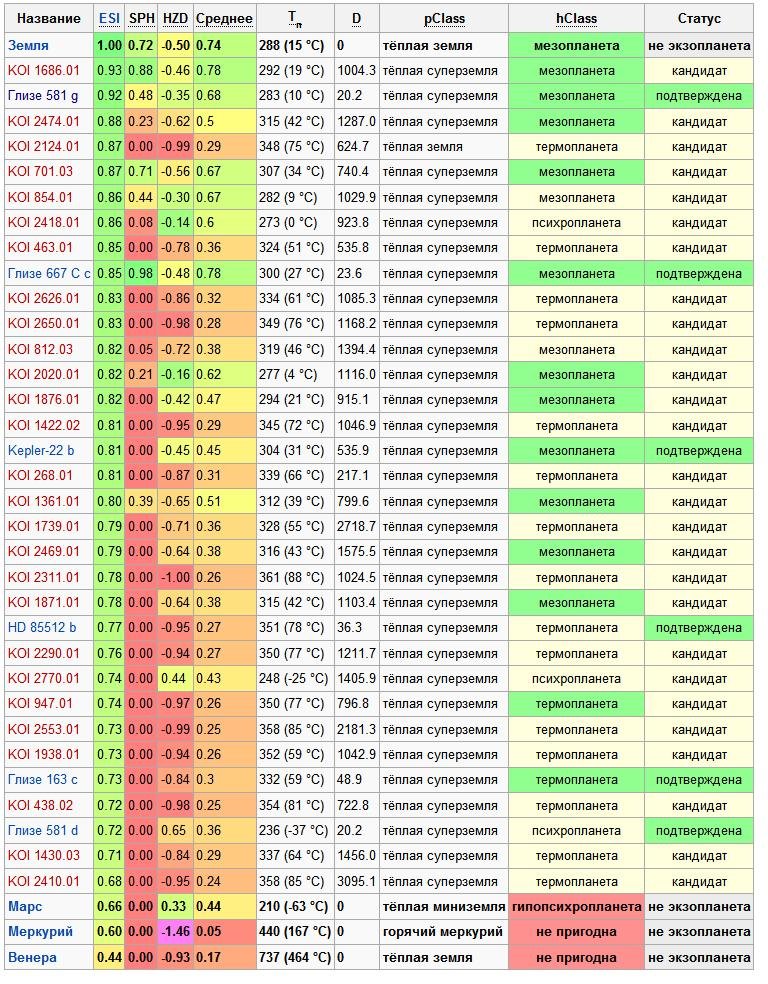 Таблица наиболее подходящих для жизни планет: