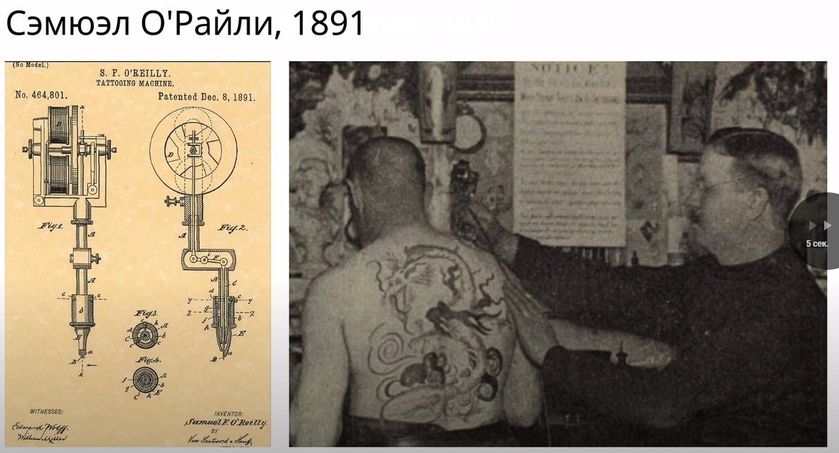 Позже, татуировщик Сэмюэл О'Рейли доработал идею, создав первую электрическую тату-машинку. Наследники которыми пользуются и сейчас.