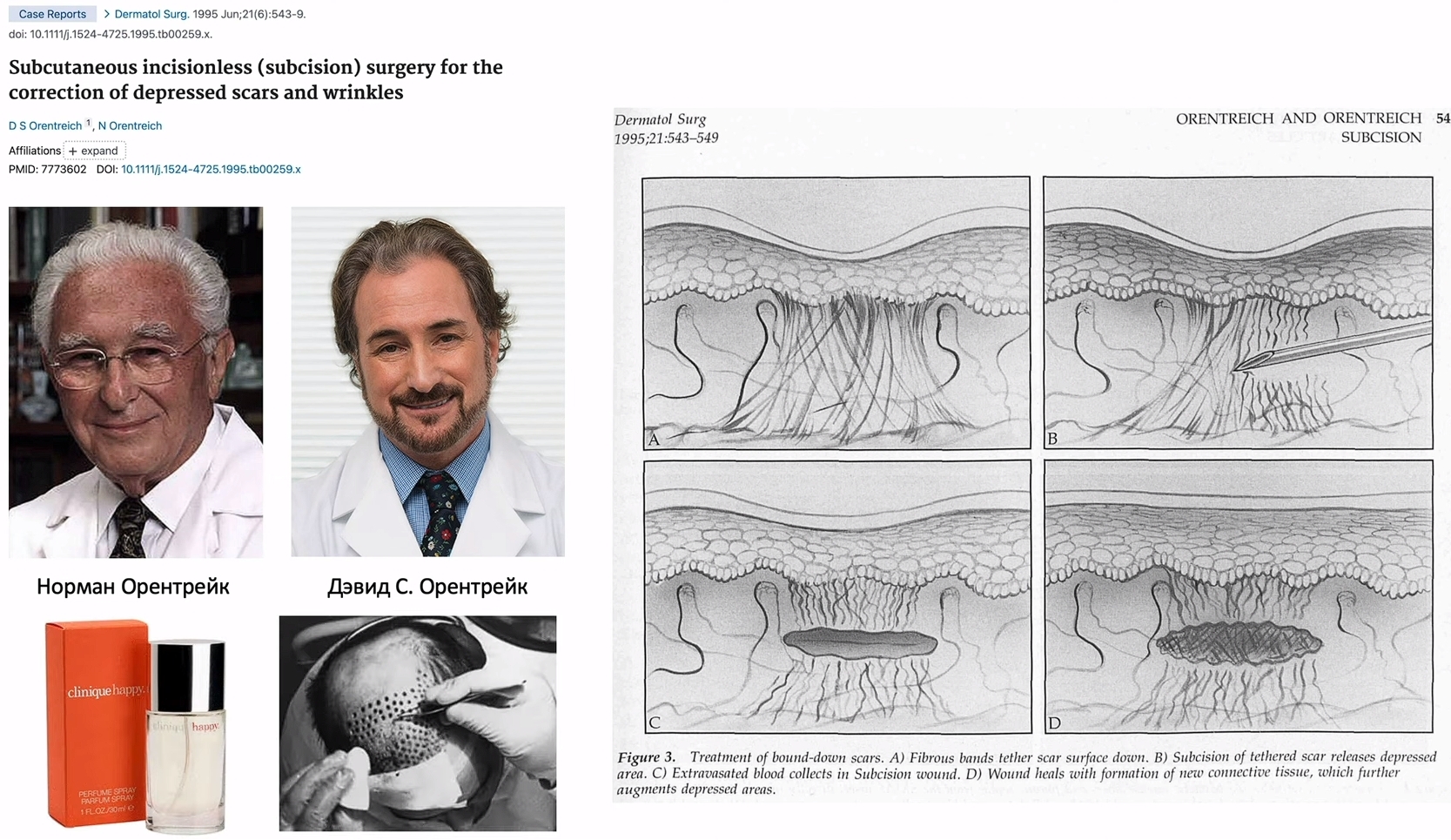 В 1995 году доктор Норман и Дэвид Орентрейк (отец и сын) рассказали как они могут лечить морщины с помощь такой безоперационным подсечением.