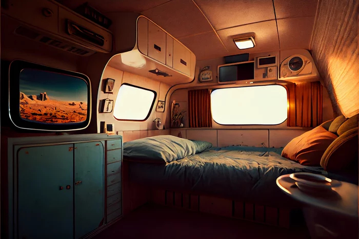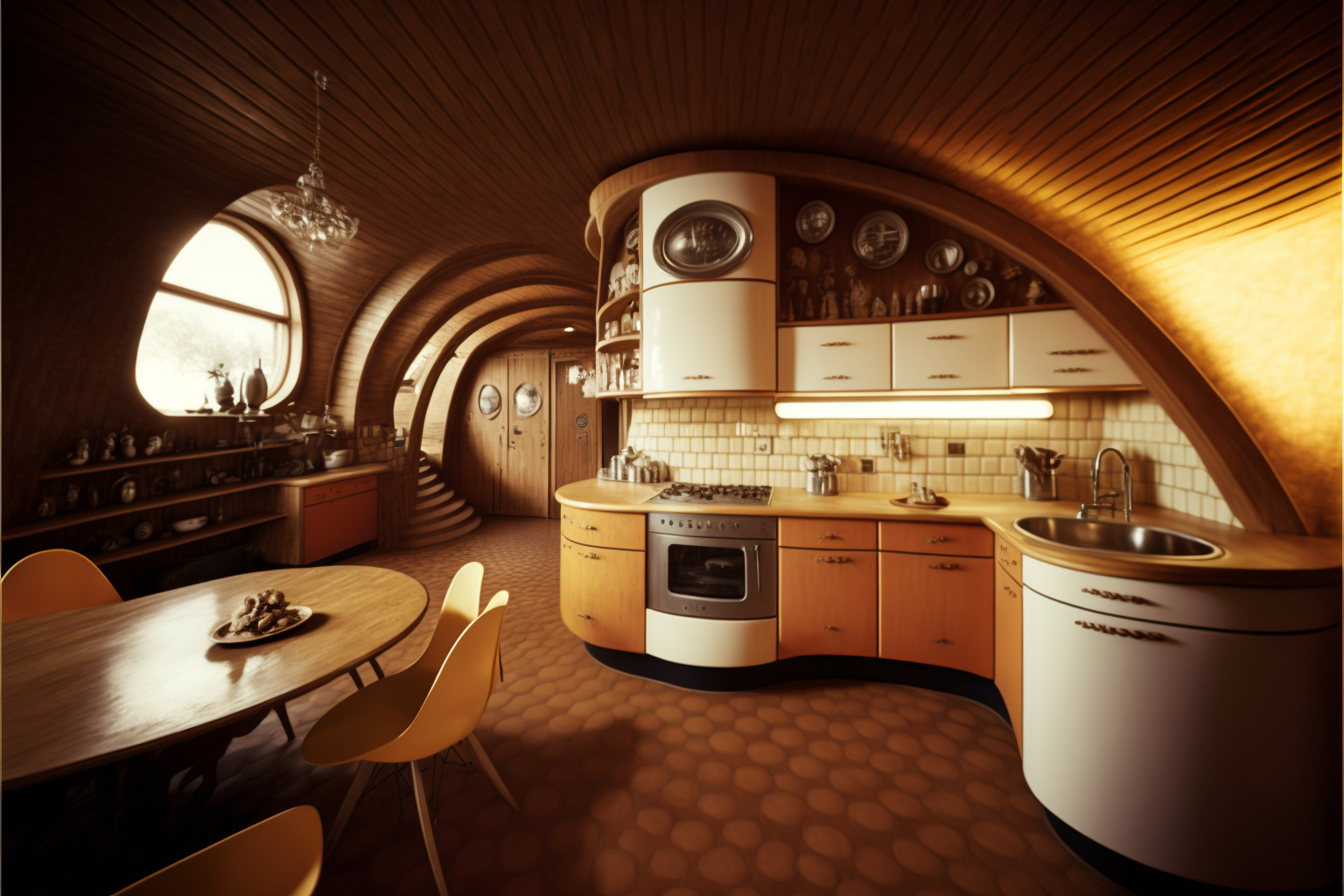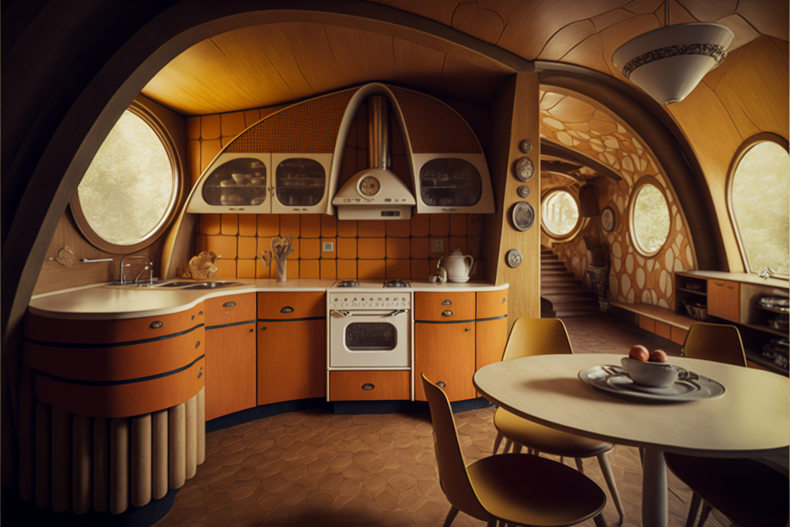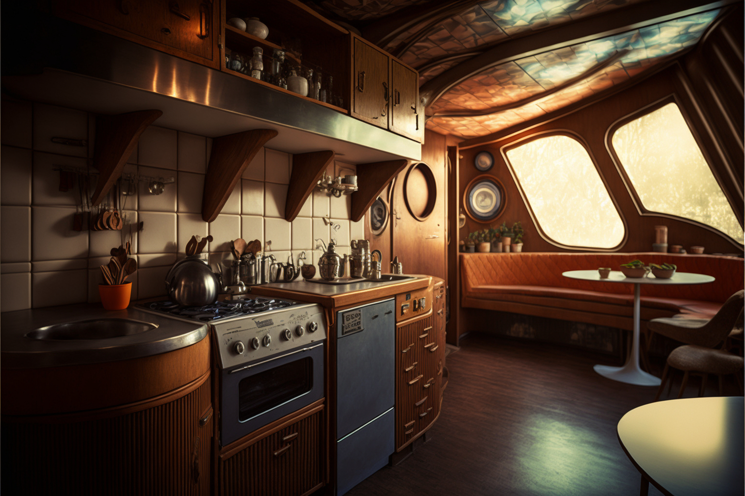 Kitchen, interior of retrofuturistic house, 1960th, Fallout style, Vault-Tec style, Cinematic shot + photo taken by ARRI, photo taken by sony, photo taken by canon, photo taken by nikon, photo taken by sony, photo taken by hasselblad + incredibly detailed, sharpen, details + professional lighting, photography lighting + 50mm, 80mm, 100m + lightroom gallery + behance photography + unsplash --ar 3:2 --v 4 --upbeta