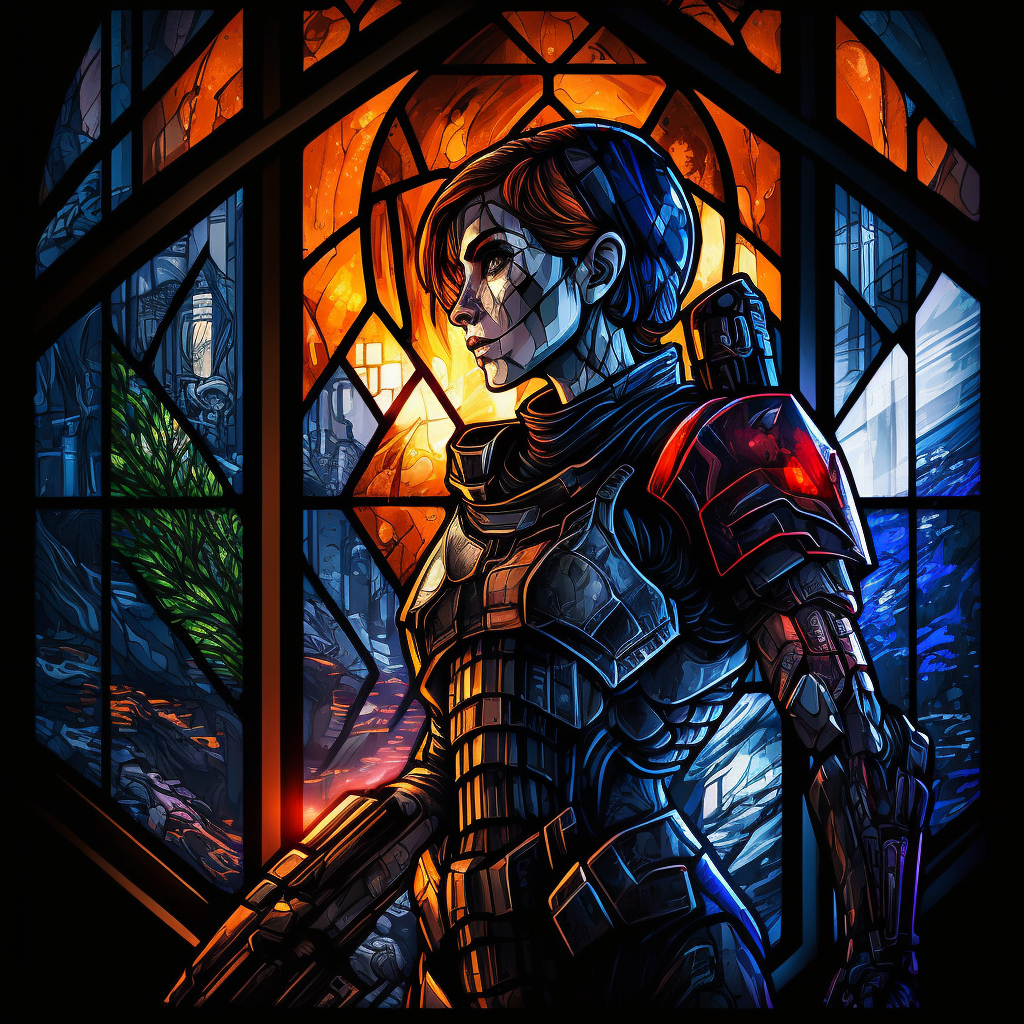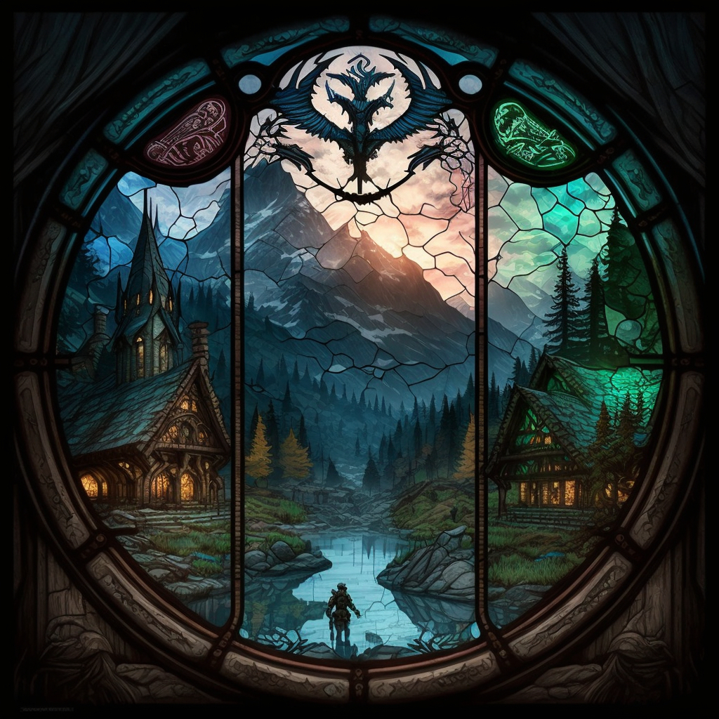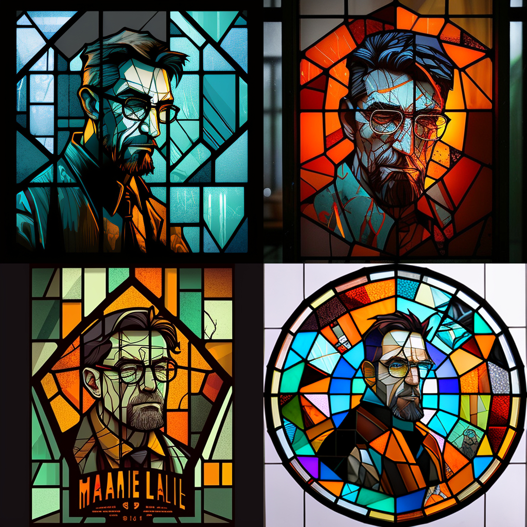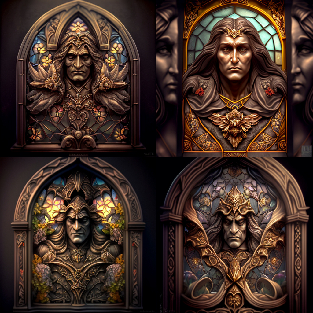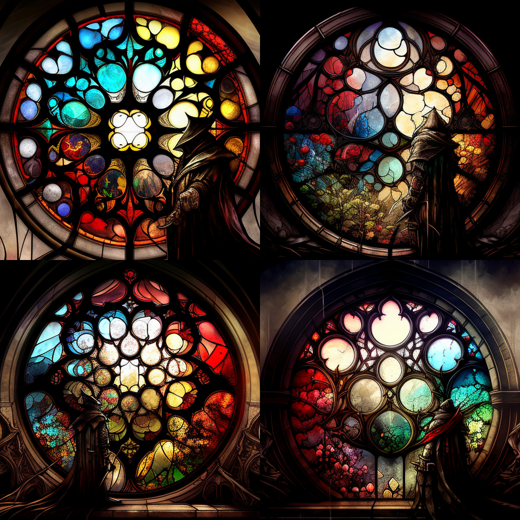 Все картинки были сгенерированы с параметром "stained glass window" на версии V4 с тематикой видеоигр.