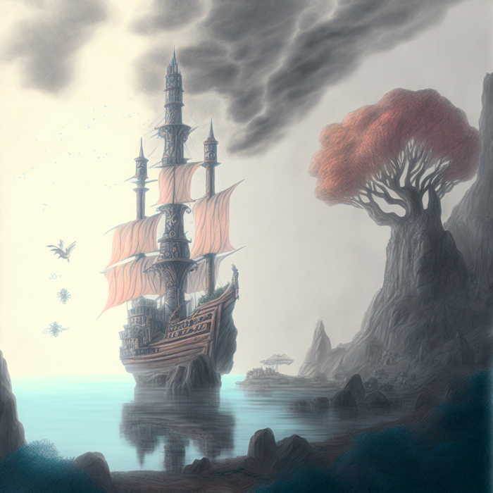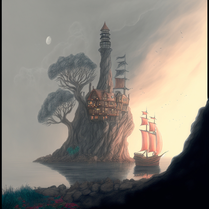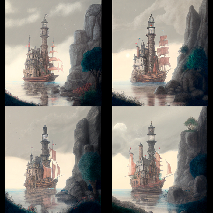 А здесь уже не корабль, а маяк построенный в виде корабля. То же найдет свое место в новой истории. Не думаю, что мои эксперименты в нейросети это что-то бестолковое и несерьезное. Сразу столько идей в голове возникает.