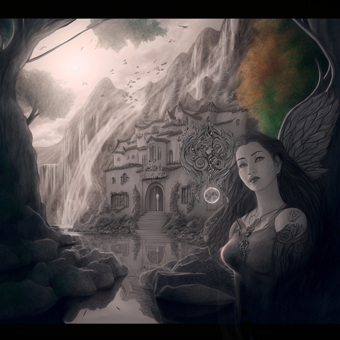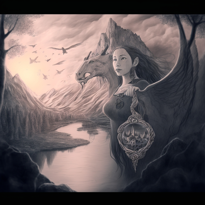 Наиболее удачное изображение. Даже дракон появился, как я люблю. Причем на фоне величественной горы. Внешность девушки претерпела изменения. Но вот что у нее с рукой? Она не то медальон держит, не то свое крыло. В фотошопе трудно будет исправить, лучше перерисую. Может, что-то своего добавлю. Кстати, что у нее в медальоне? Изображен какой-то город. Пусть она в моей истории повстречается кому-нибудь из главных героев. Подскажет путь.
