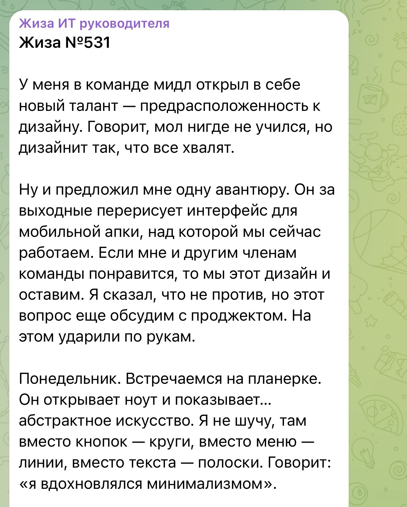 4 zhizait Мидл открыл в себе новый талант 15 часов назад Источник: «Жиза ИТ руководителя» Работа IT Истории из жизни Тимлид Дизайн Программист Telegram (ссылка) Длиннопост 2 1 Ещё 0