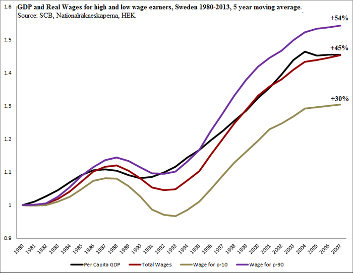 Тем не менее, когда левые политики говорят, что мы должны посмотреть на Швецию, чтобы увидеть результат политики "демократического социализма", им не понравится то, что они обнаружат - либеральная сказочная версия Швеции далека от реальности той страны, которую обогатил свободный рынок. поставил в тупик "социализм" и снова возродили рыночные реформы. Эра шведского "социализма" была отмечена экономической стагнацией, нулевым ростом рабочих мест, падением зарплат, ростом долга и в конечном счете экономической депрессией. В конце концов тем, чего можно было ожидать. И лишь после радикального сокращения государственных расходов, рыночных реформ и приватизации Швеция снова вернулась к экономическому росту. И снова, как этого можно было ожидать.