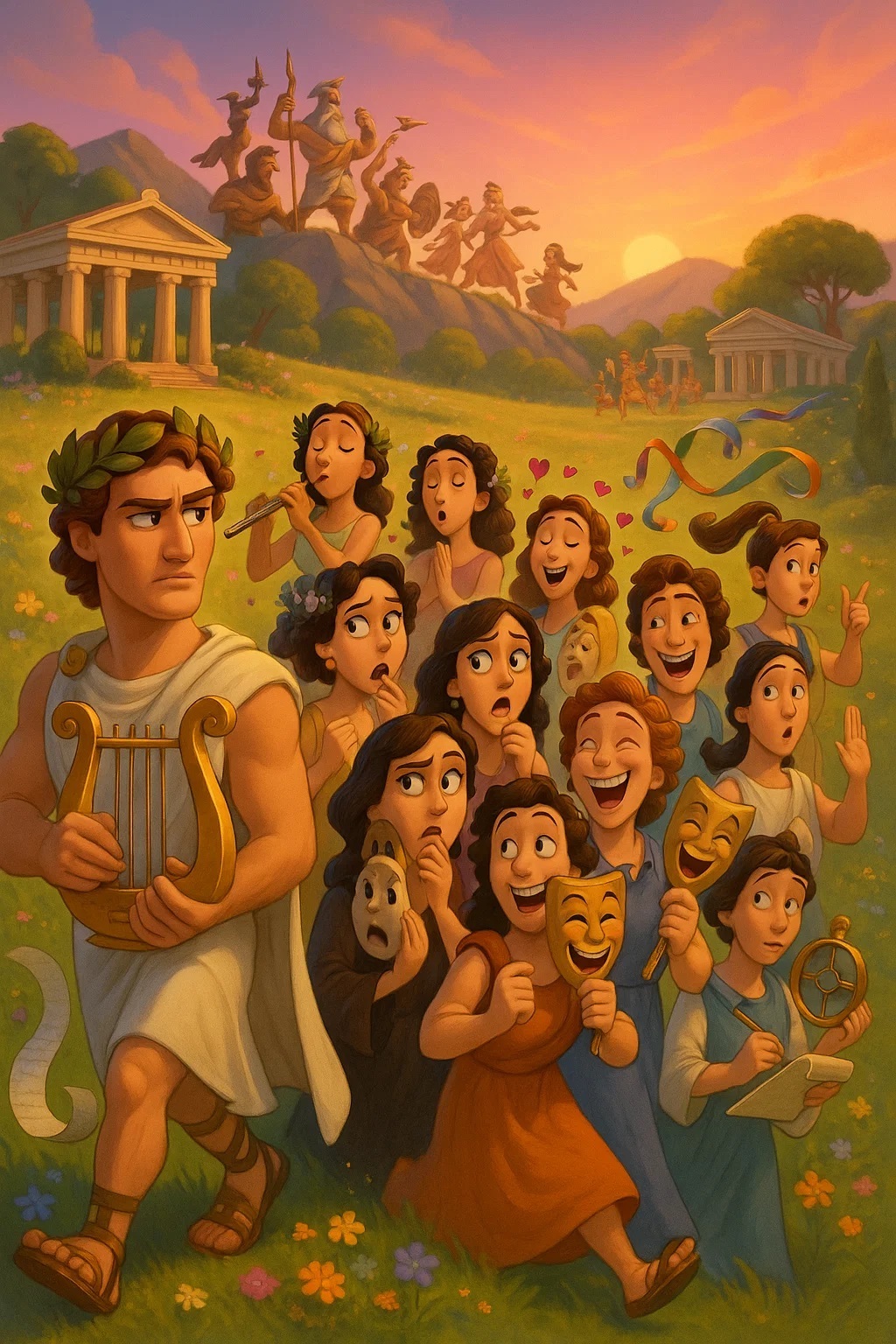 В лавровом венке, серьёзный, будто у него ипотека на Парнас. Впереди шагает — он же руководитель хора. За ним девять муз, каждая со своей спецухой: