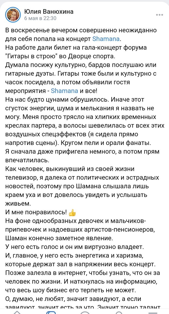 Далее. SHAMAN слушают иностранцы. Покупают диски, приезжают на концерты в Россию.