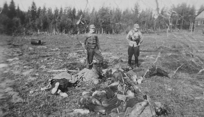 На фото: финские солдат и офицер у тел расстрелянных на окраине Петрозаводска советских пленных.