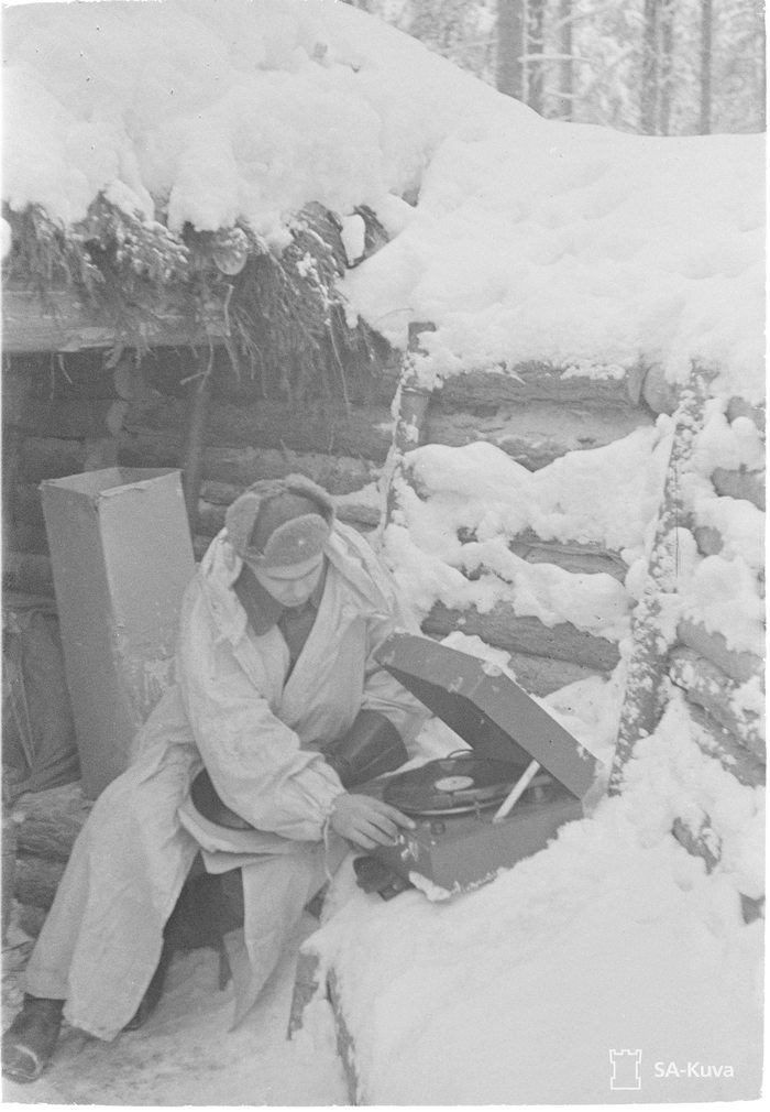 На фото: финский солдат слушает музыку после боя. Район Кухмо.