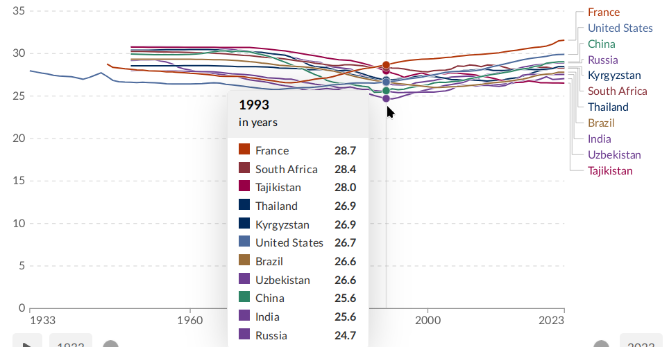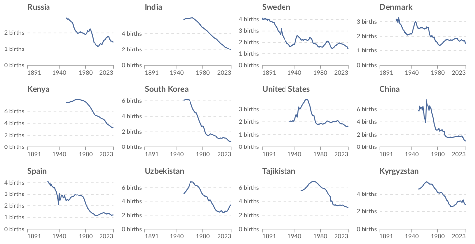 Что-то не особо видно, что Россия как-то выделяется на фоне Средней Азии и в целом на фоне мира. Везде всё одинаково. После 40гг XX века идёт подъёмчик и потом плавный спад с колебаниями и без.